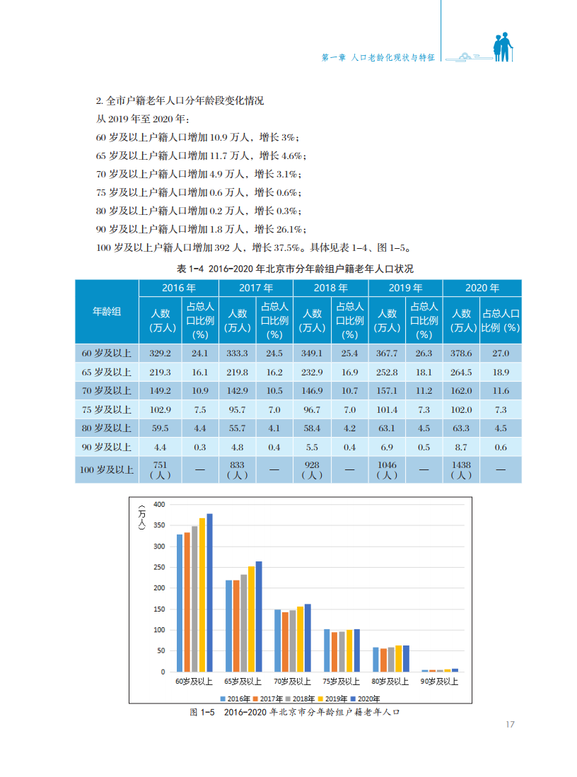 北京市老龄事业发展年度报告以上一年老年人口数据为基础,分年龄、分性别、分地区对全市老年人口情况进行解读。同时就养老保障、养老服务、老龄产业、老年友好型社会建设、老年人社会参与、老年优待与权益保障等政策及实践进展进行阐述,直观反映出北京市老龄事业取得的最新成果。