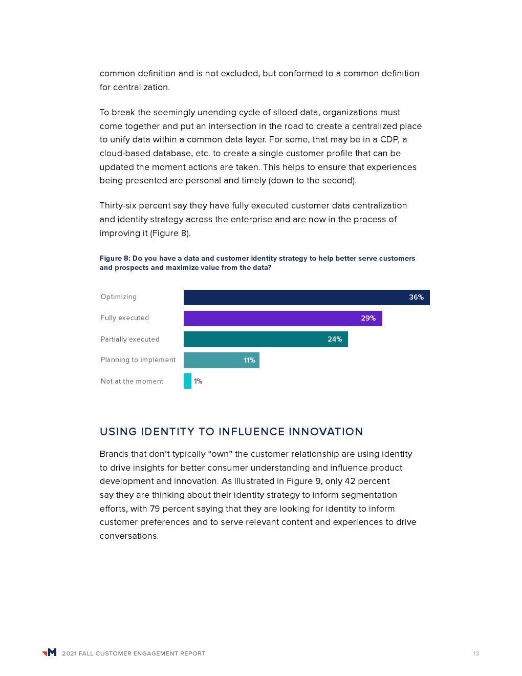96%的受访者表示,他们有能力实时解决个人层面的身份识别问题。为了更好地为客户和潜在客户服务,并最大限度地利用客户数据实现价值,29%的受访者制定了全面执行的数据和客户身份战略。36%的受访者不仅有一个全面执行的战略,而且正在对其进行优化。