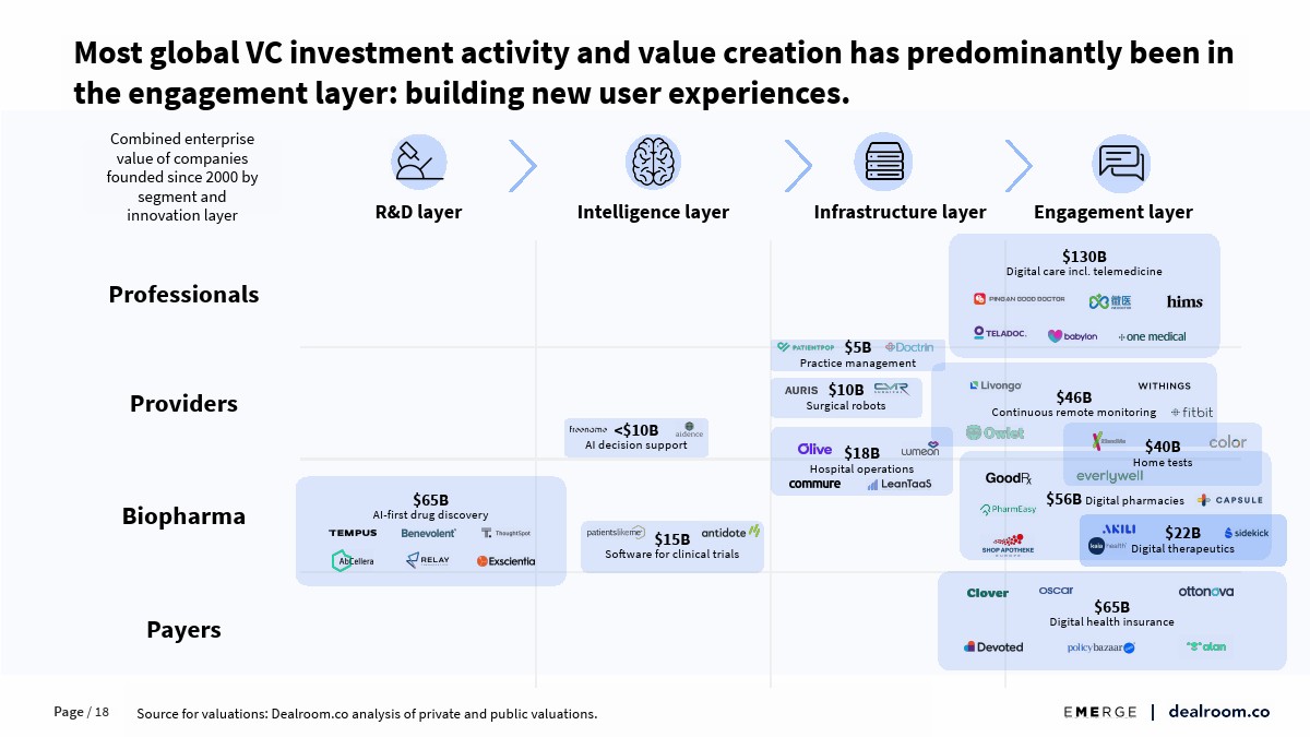全球健康科技公司的总价值已达到1.7万亿美元,自2016年以来增长了5.5倍。生物技术公司的估值为2万亿美元,自2016年以来增长了5.4倍。