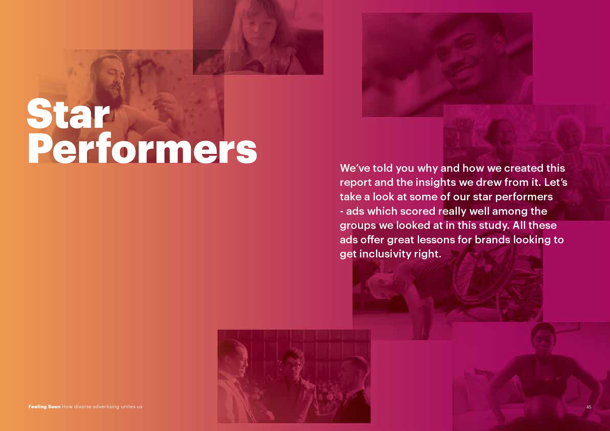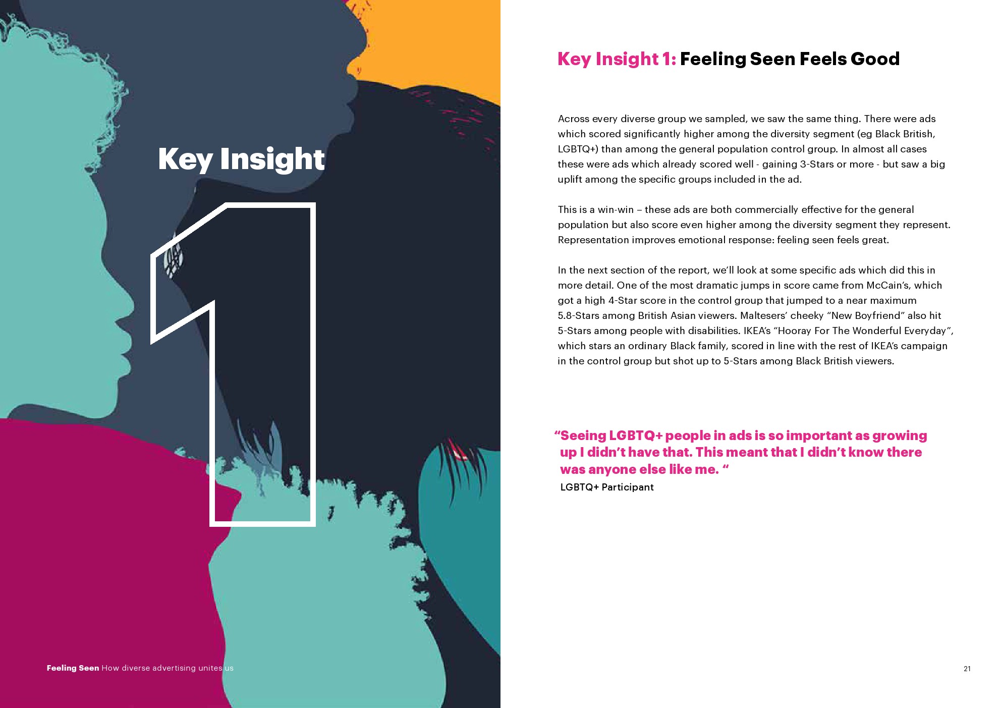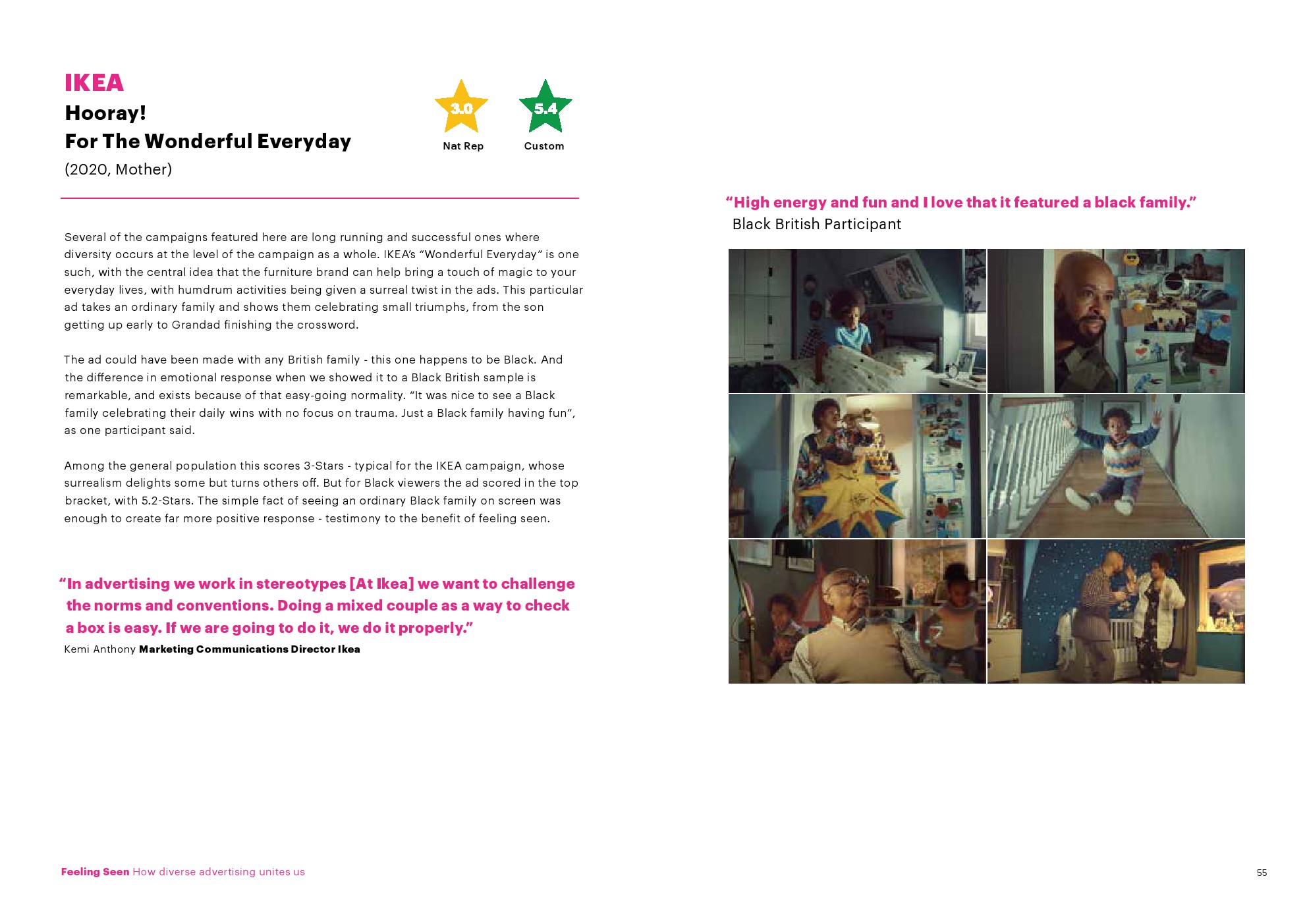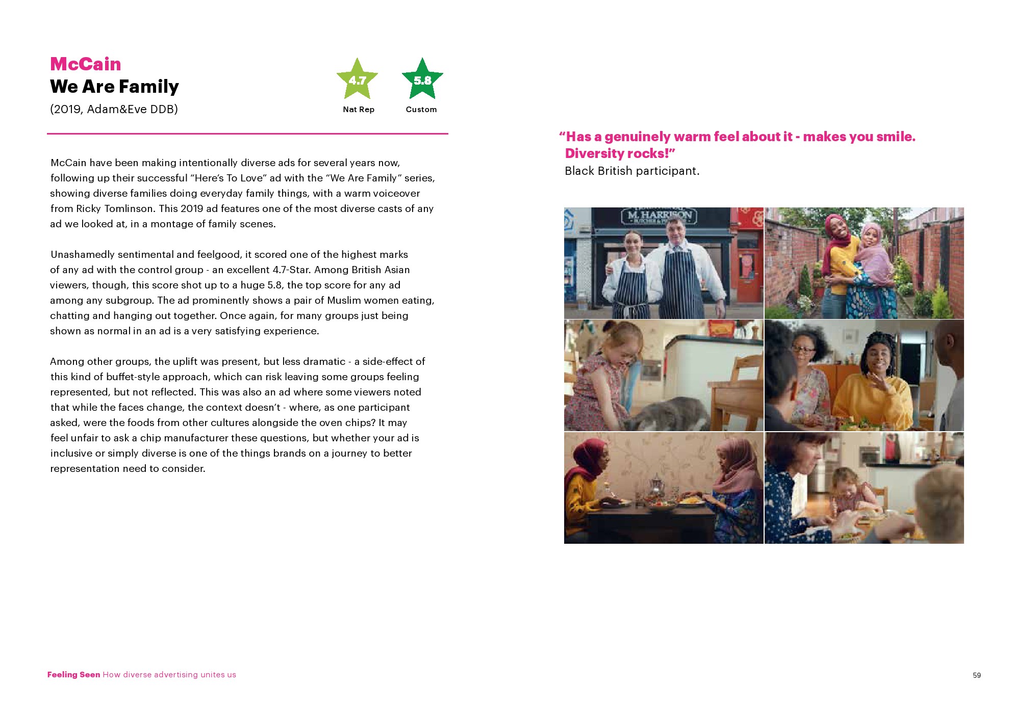 System1研究了六个非洲裔人在广告中表现的例子并得出结论:所有广告在使用英国非洲裔人样本进行测试时,效果都有了很大的提升。但它也观察到,不同的广告可能会影响团结观众。根据调查结果报告提出了一些见解: