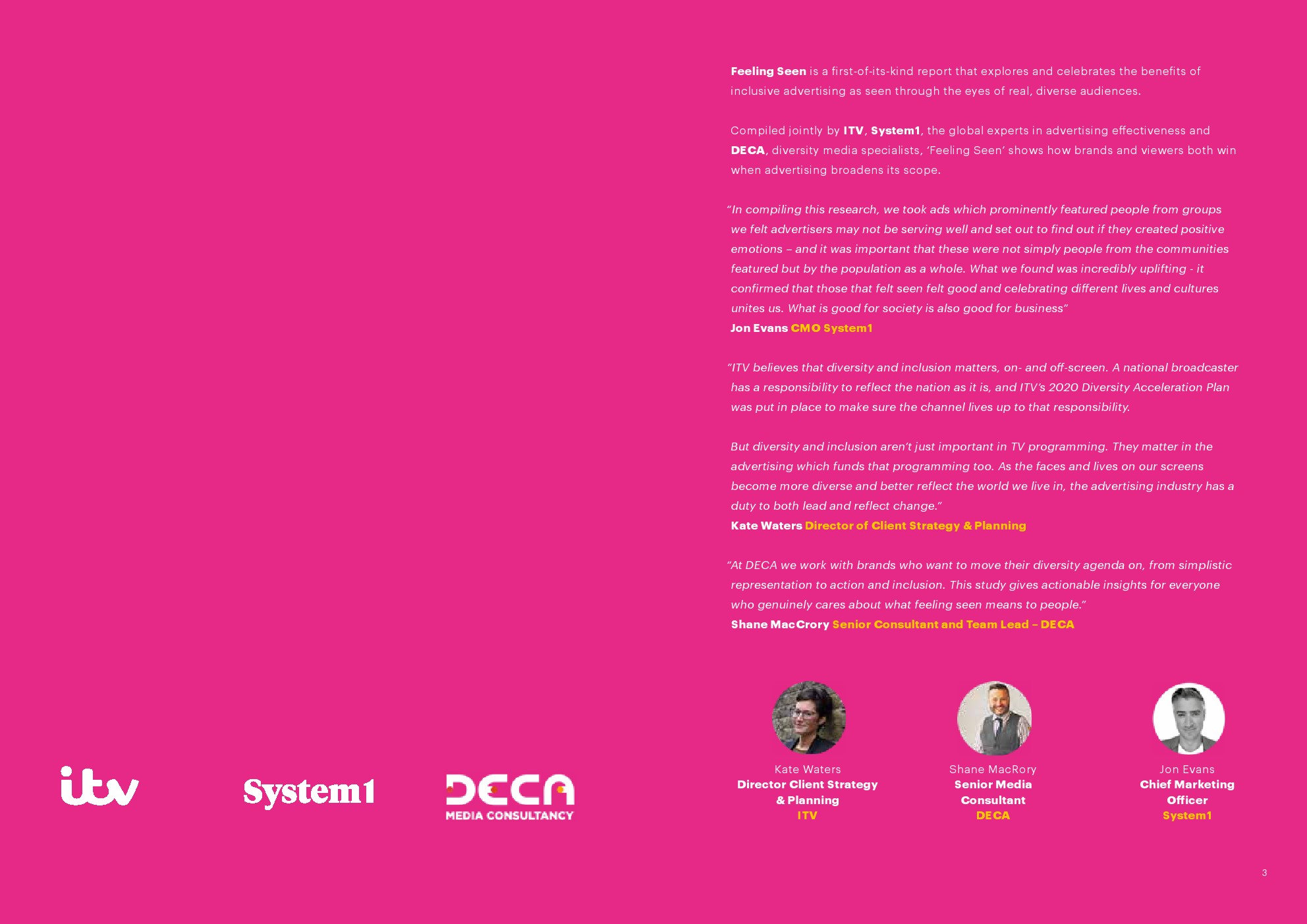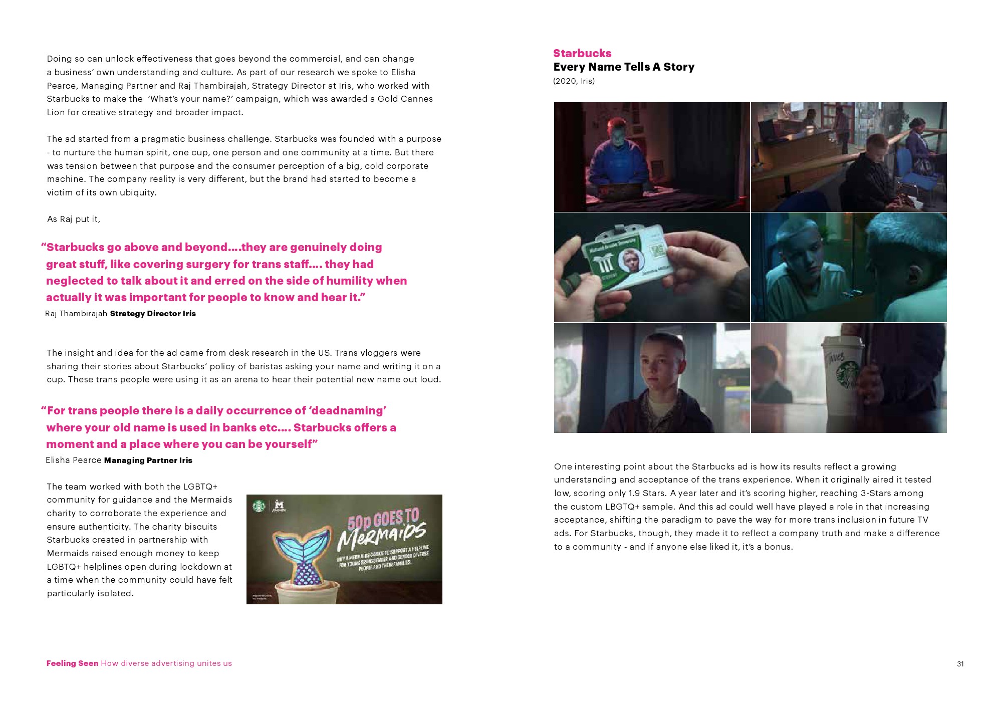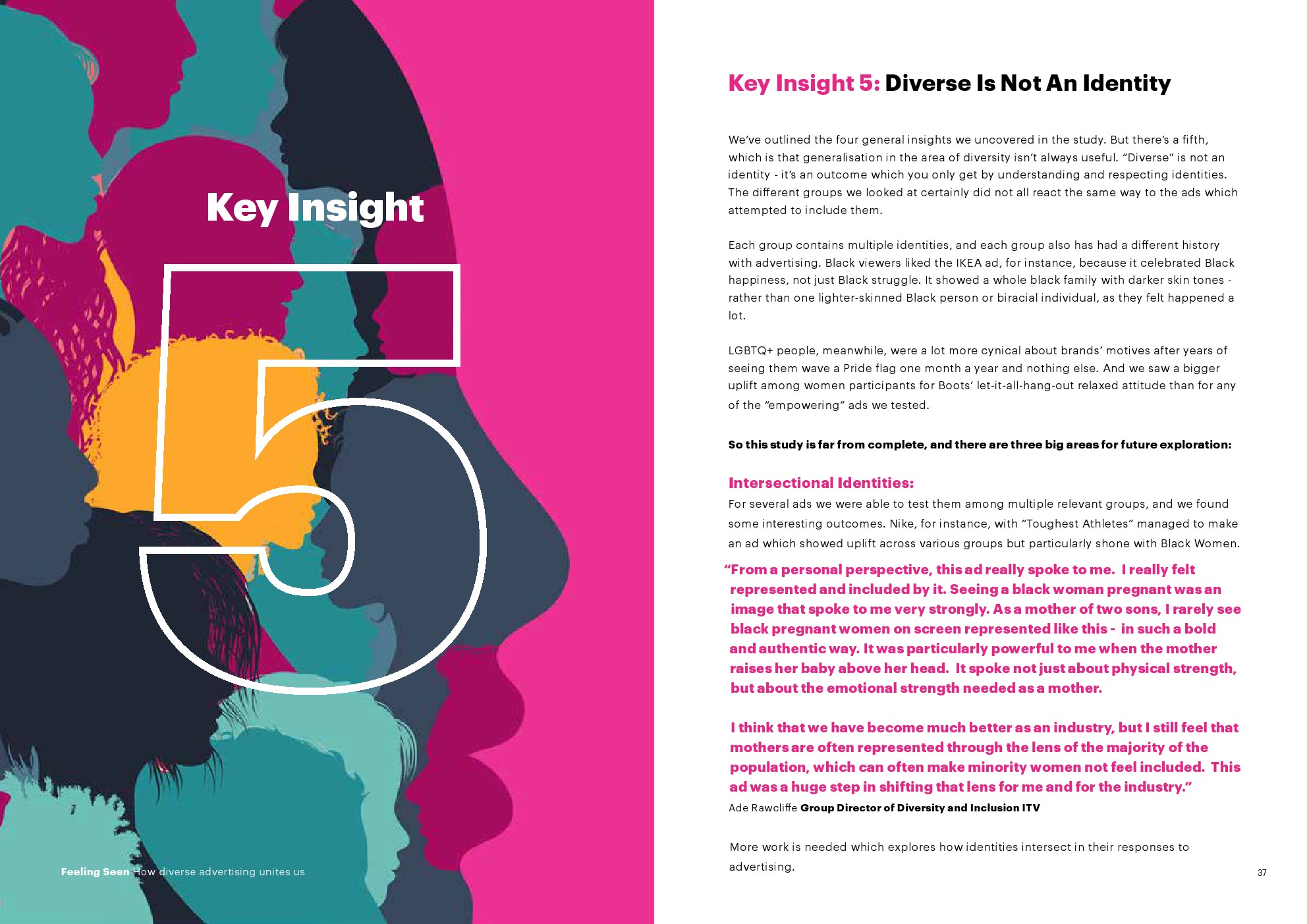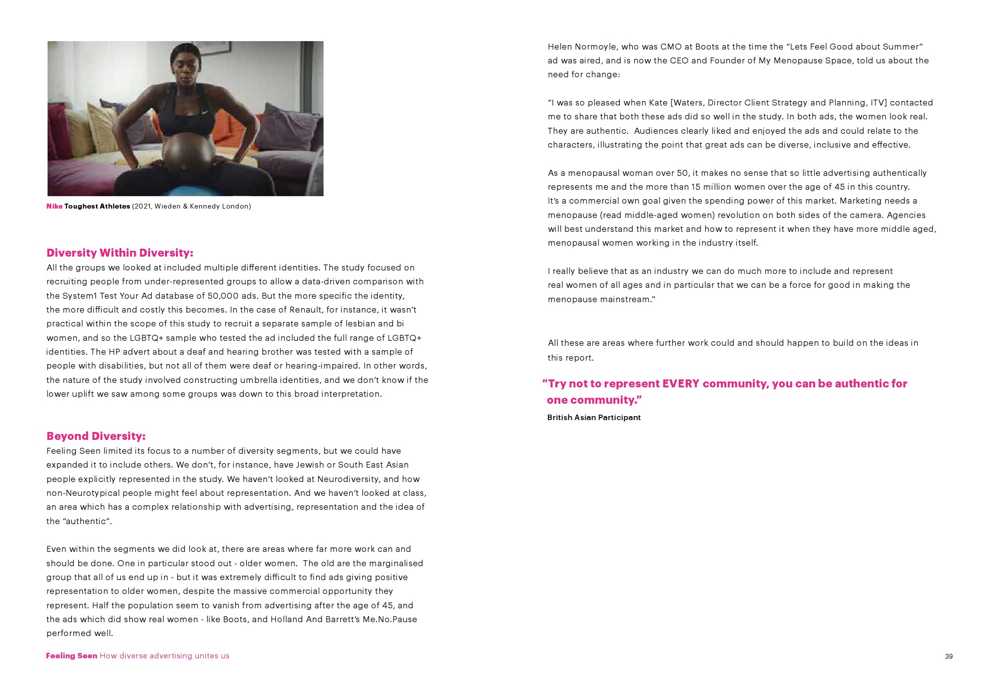 System1研究了六个非洲裔人在广告中表现的例子并得出结论:所有广告在使用英国非洲裔人样本进行测试时,效果都有了很大的提升。但它也观察到,不同的广告可能会影响团结观众。根据调查结果报告提出了一些见解: