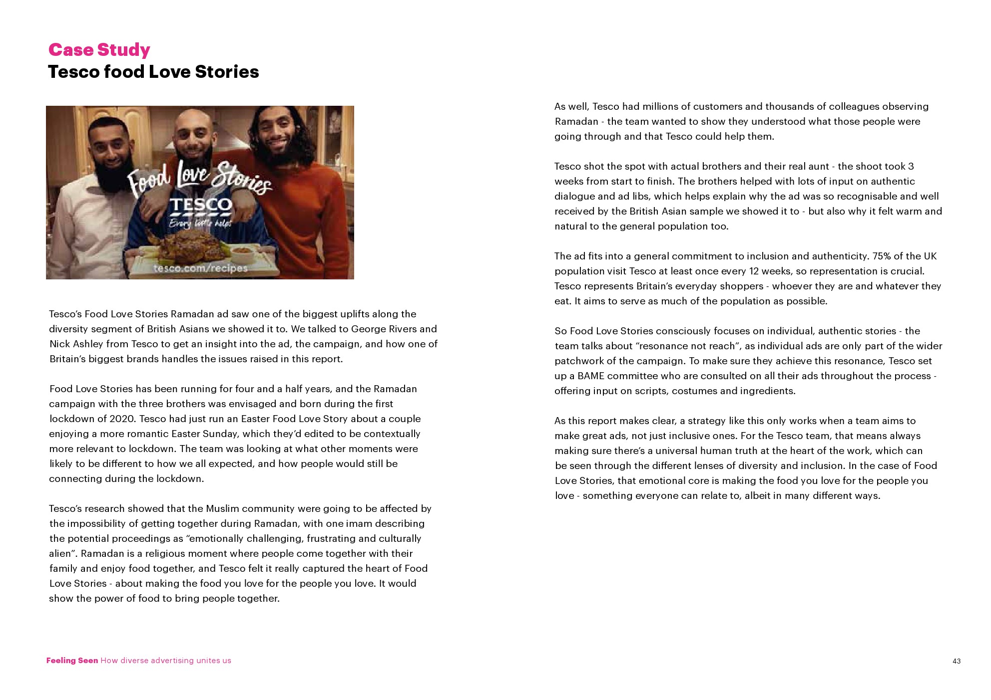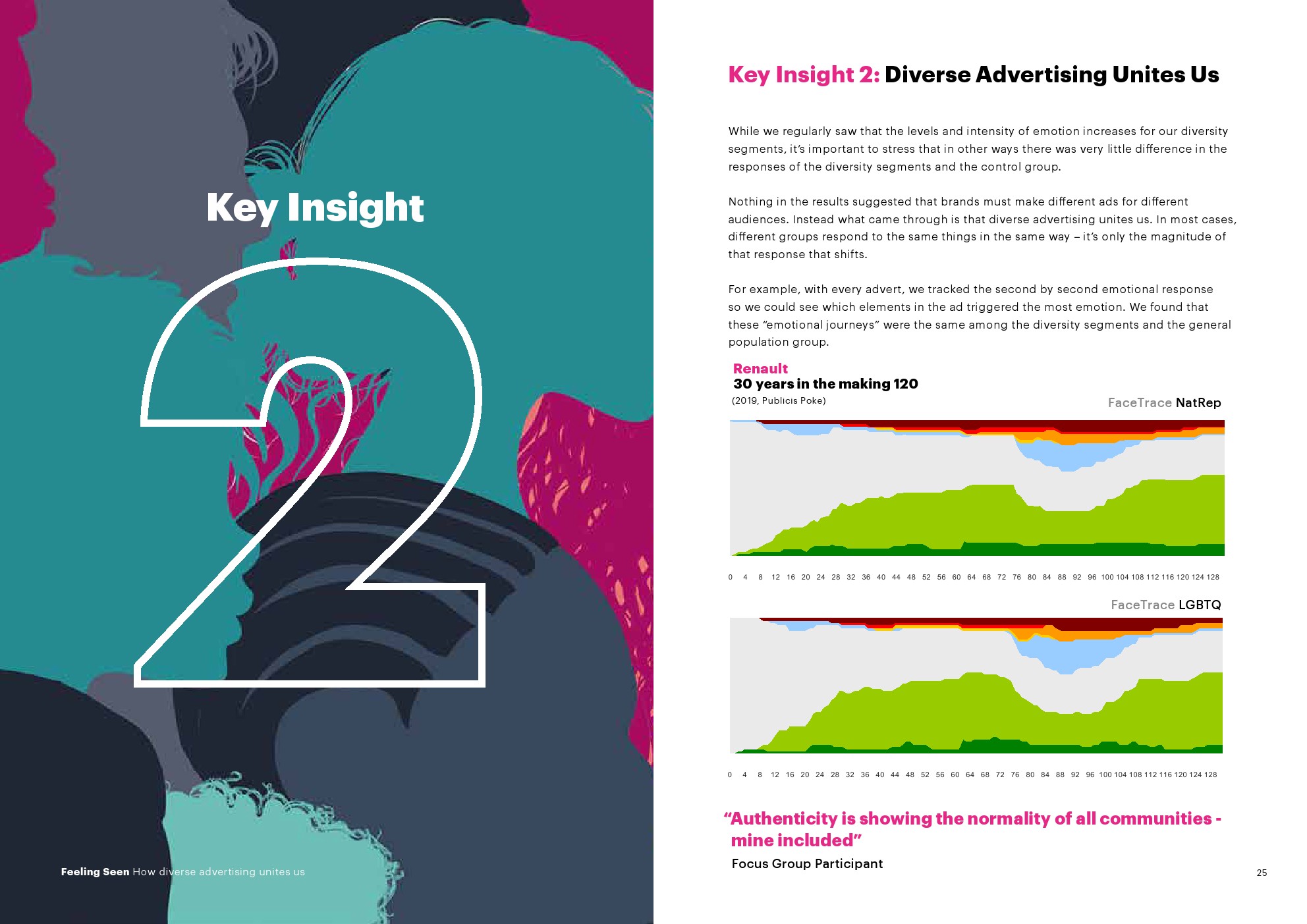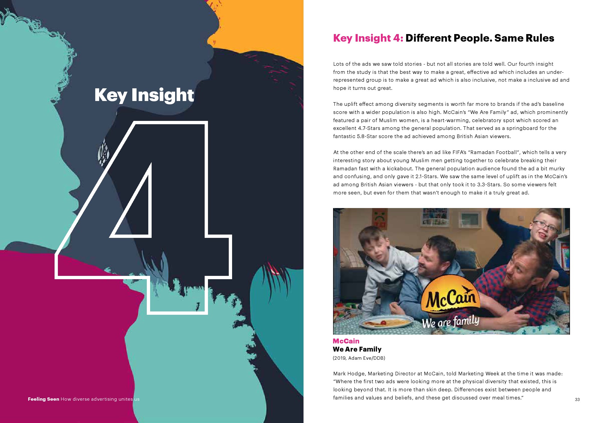 当人们在屏幕上看到自己的生活或文化时,会产生更强烈的情感共鸣。这项研究还表明,在某种程度上,对少数群体有强烈吸引力的广告通常也会吸引普通民众,证明包容性工作没有任何负面影响。