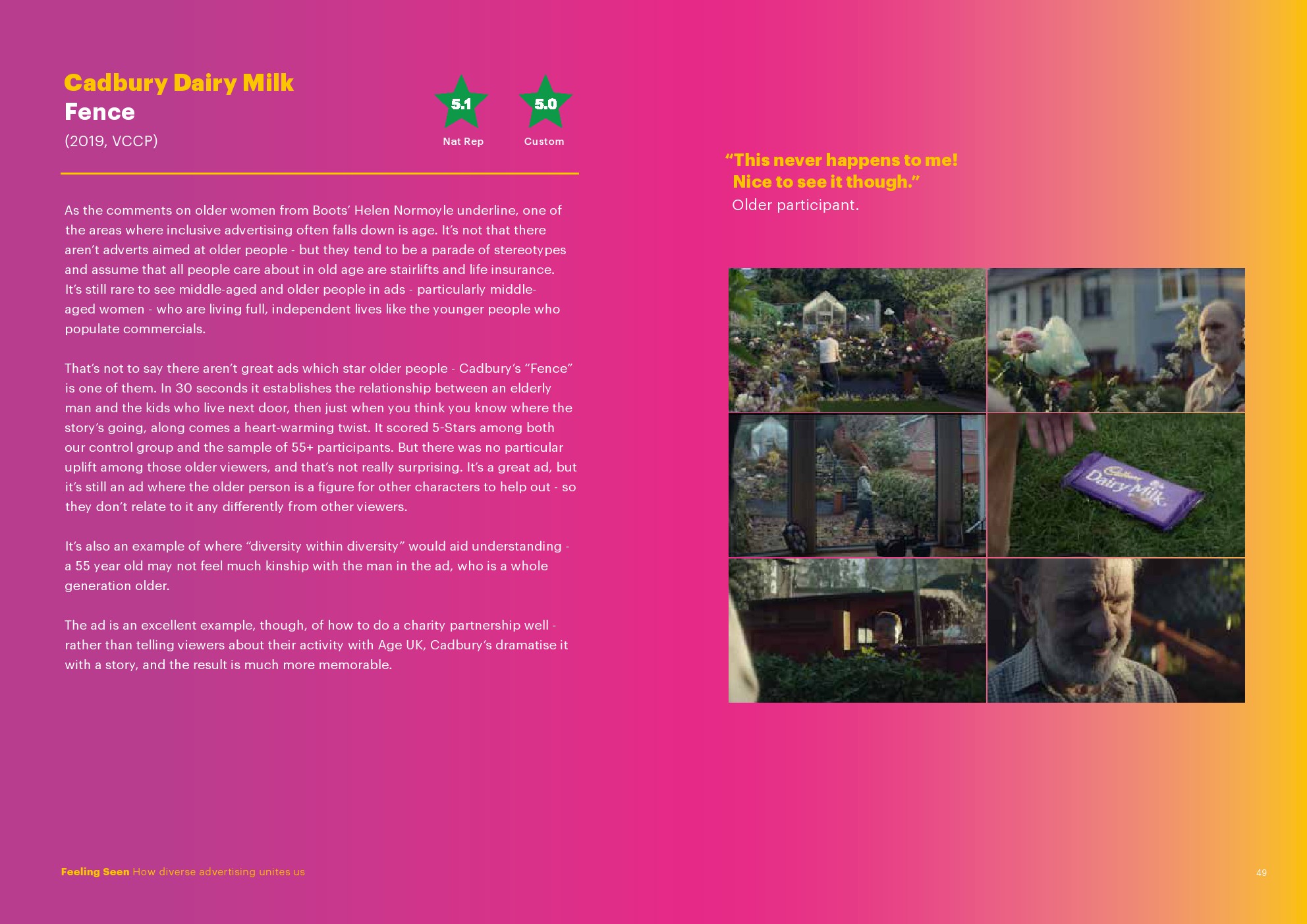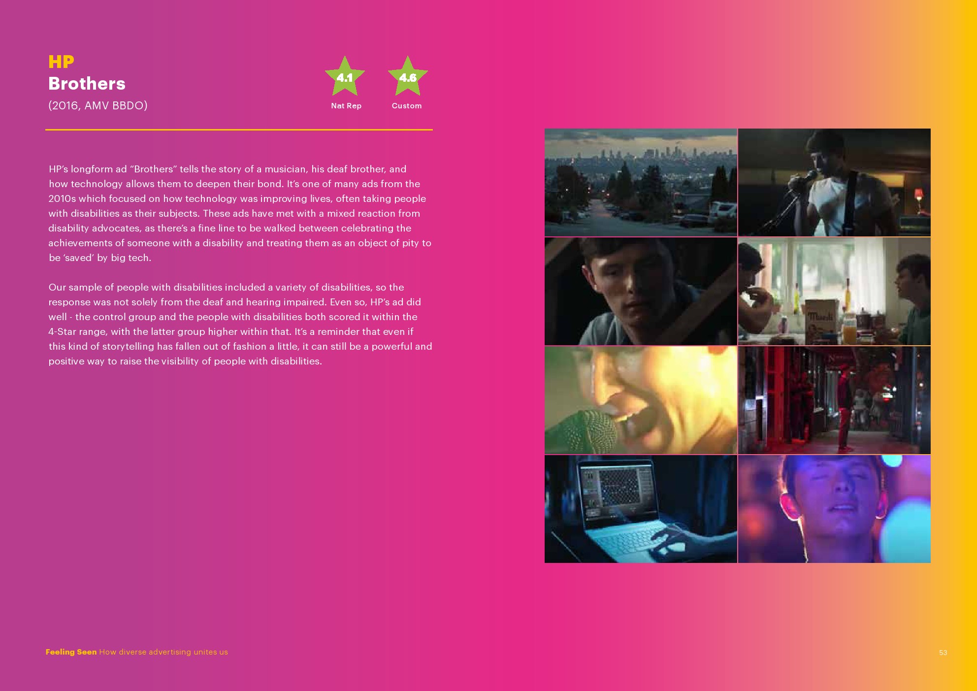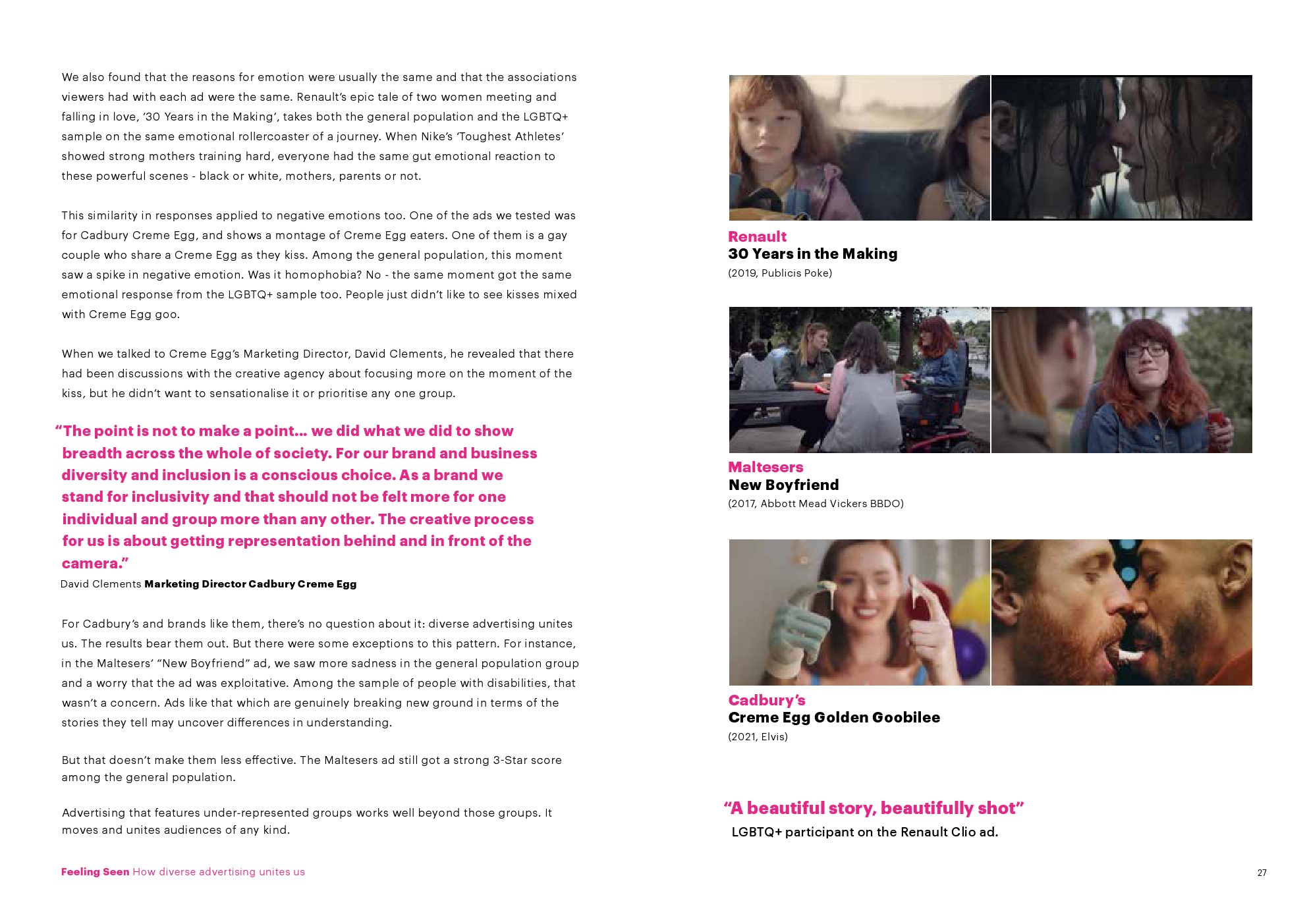 当人们在屏幕上看到自己的生活或文化时,会产生更强烈的情感共鸣。这项研究还表明,在某种程度上,对少数群体有强烈吸引力的广告通常也会吸引普通民众,证明包容性工作没有任何负面影响。