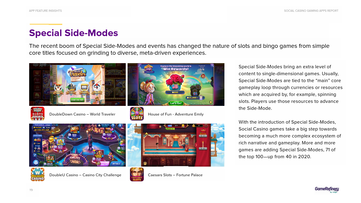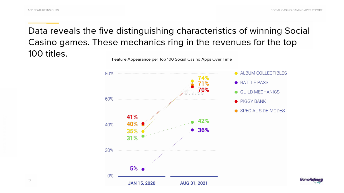 对最热门的游戏机制的分析表明,收藏物图鉴是最受欢迎的功能,在排名前100的游戏中有74款使用了这一功能。其他具有显著影响的功能包括存钱罐和战斗通行证。