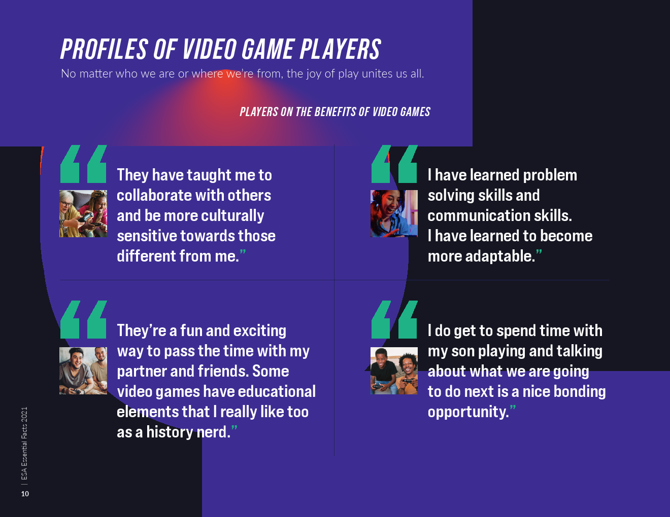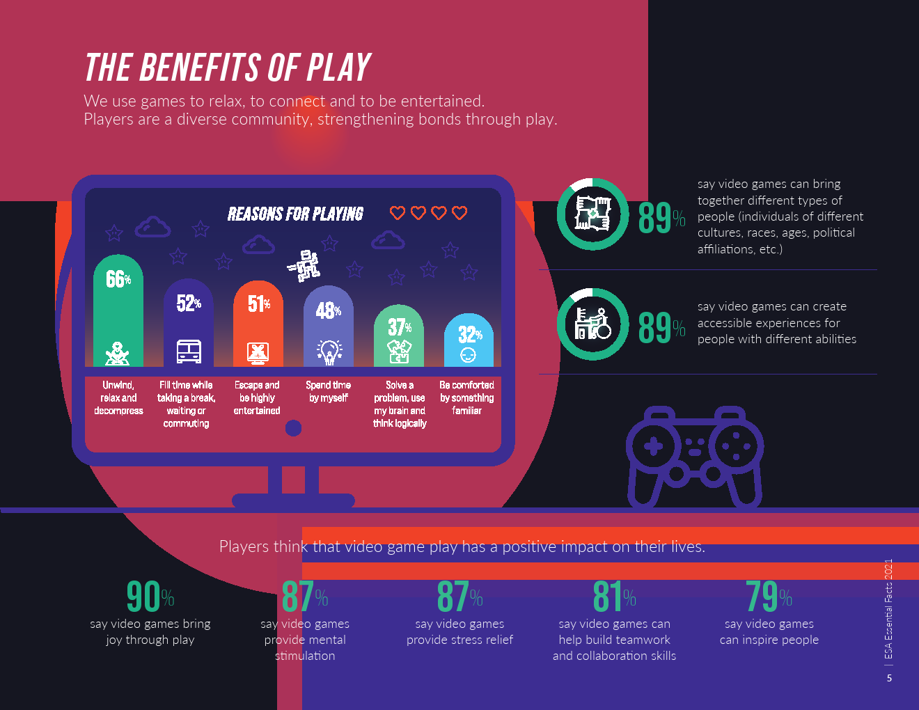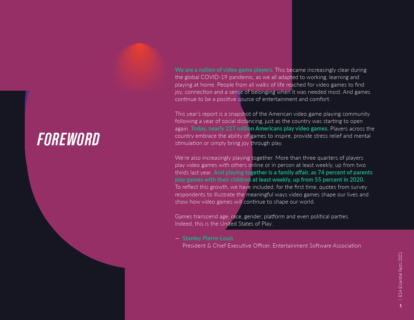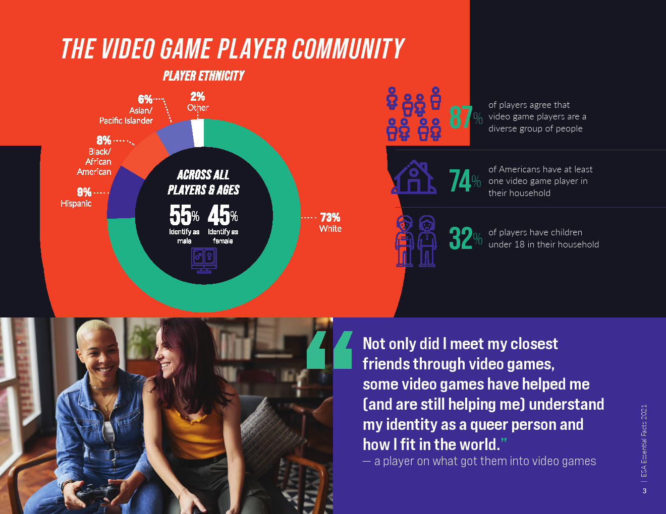 在全球新冠大流行期间,各行各业的人们都在玩电子游戏,寻找快乐、联系和归属感。游戏是美国数百万人娱乐和舒适的来源。今年的报告显示,电子游戏超越了年龄、种族、性别、平台和政党。