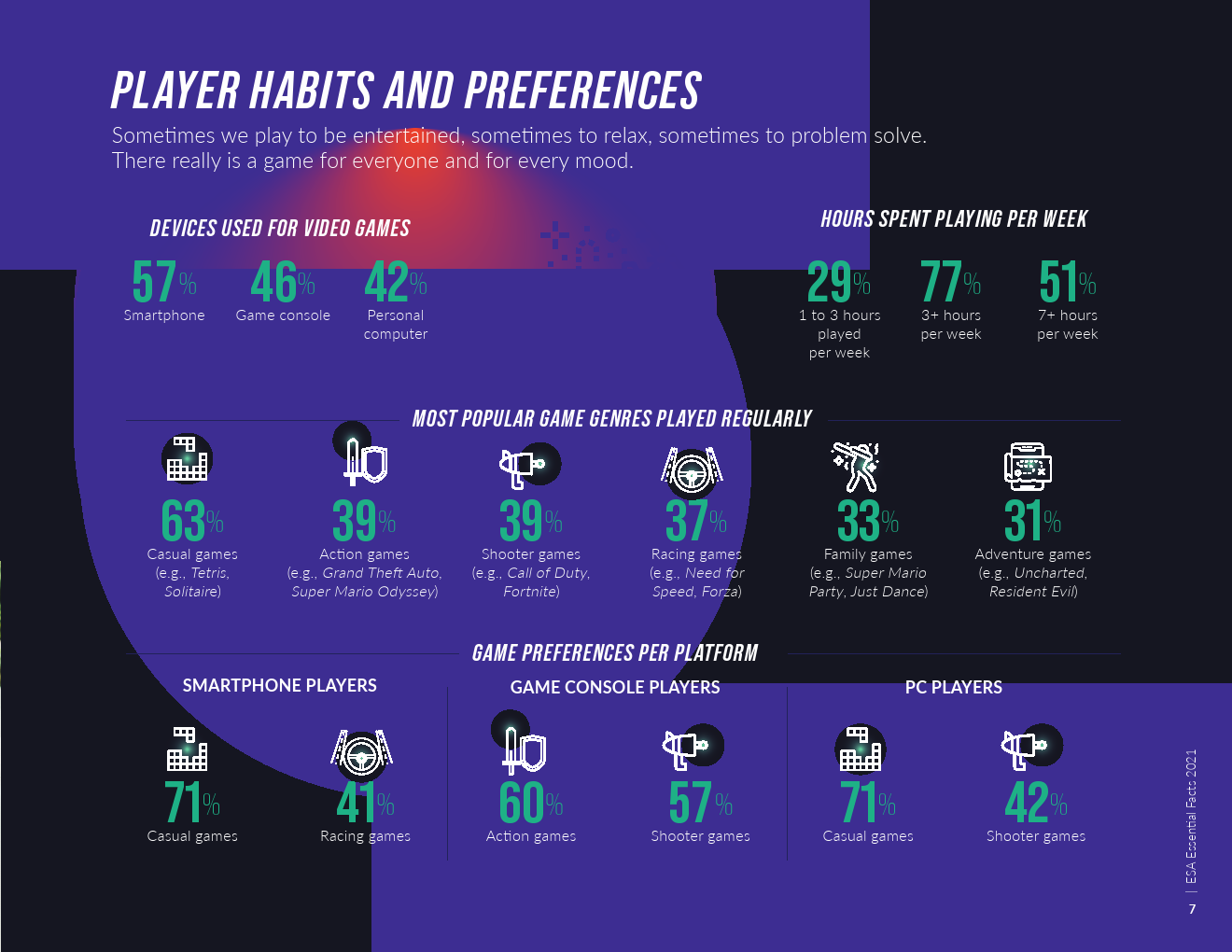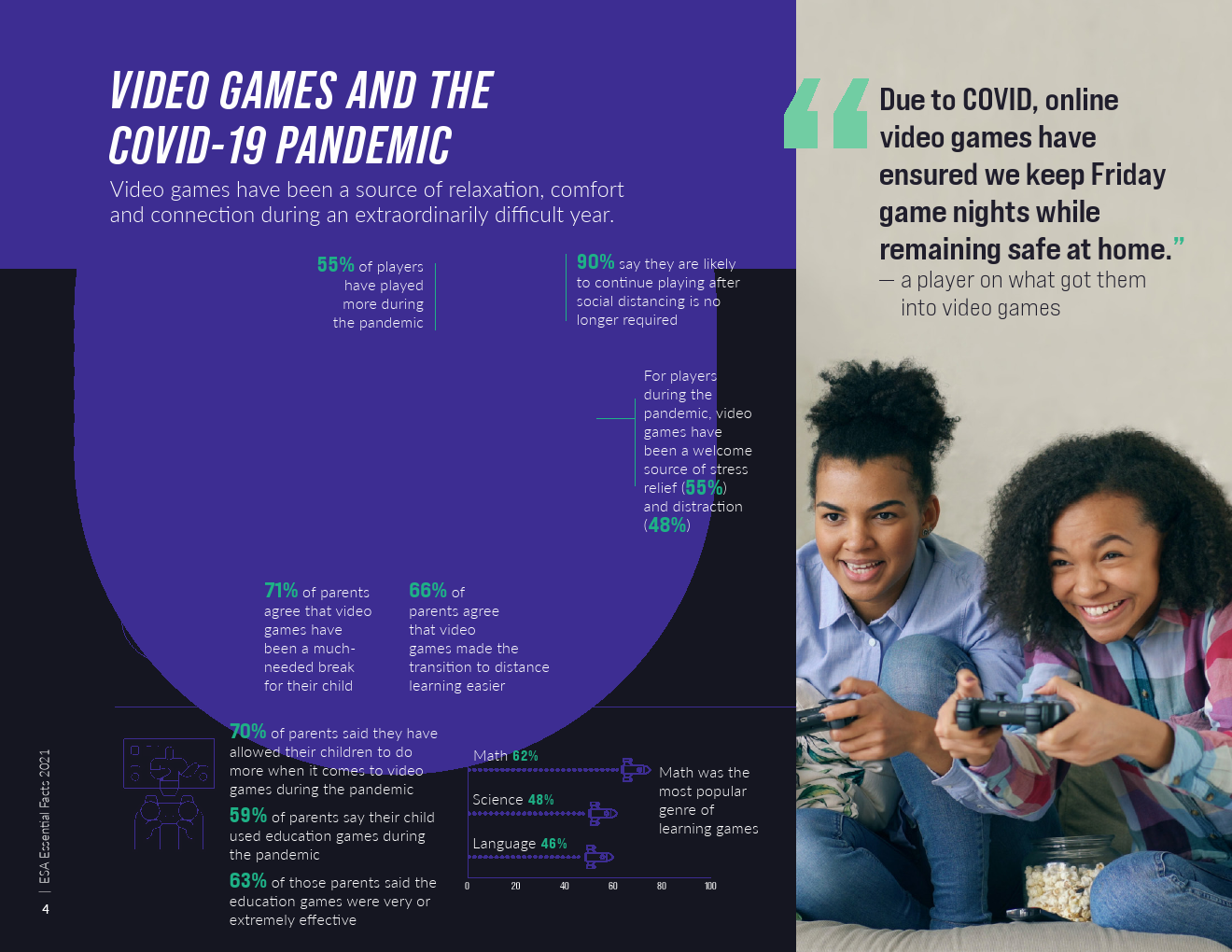 大约一半的玩家(55%)表示他们在新冠大流行期间玩了更多的游戏,大多数玩家(90%)认为他们会在国家开放后继续玩。在新冠大流行期间,71%的家长认为玩电子游戏是孩子急需的休息方式。超过一半的家长(59%)表示他们的孩子也玩教育游戏,3/4的家长(66%)表示电子游戏让他们的孩子更容易过渡到远程学习。