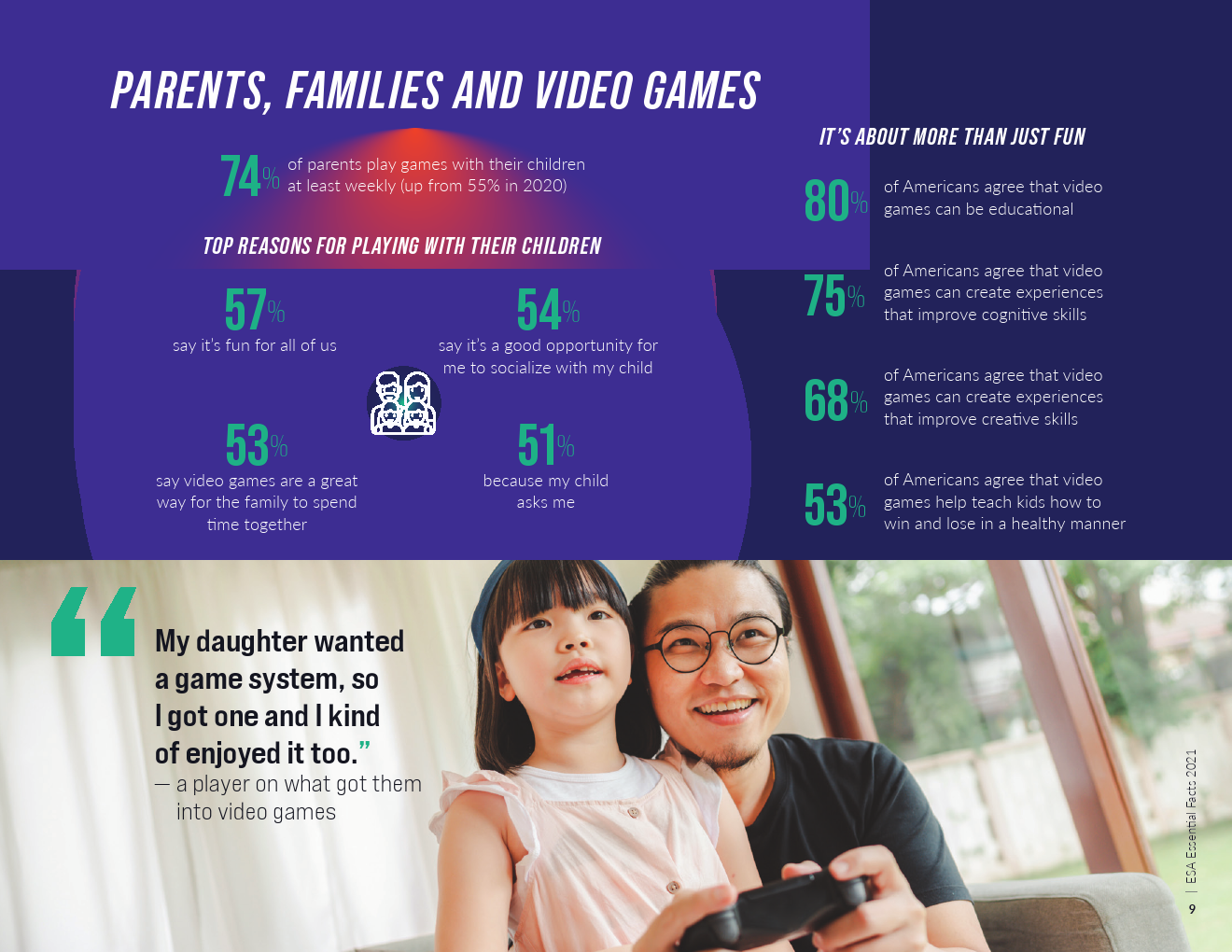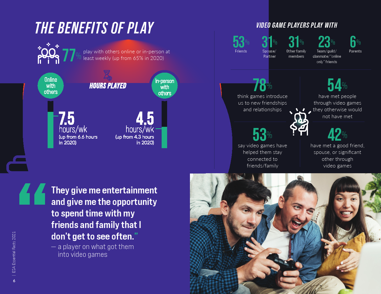 在我们最需要的时候,电子游戏帮助建立了联系和社区。今年,超过3/4的玩家表示他们与他人一起玩电子游戏,高于去年的2/3。一起玩还是一种家庭事务,74%的父母至少每周与孩子一起玩电子游戏(2020年为55%)。