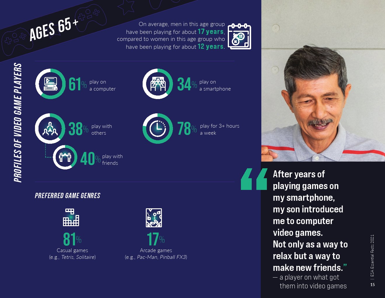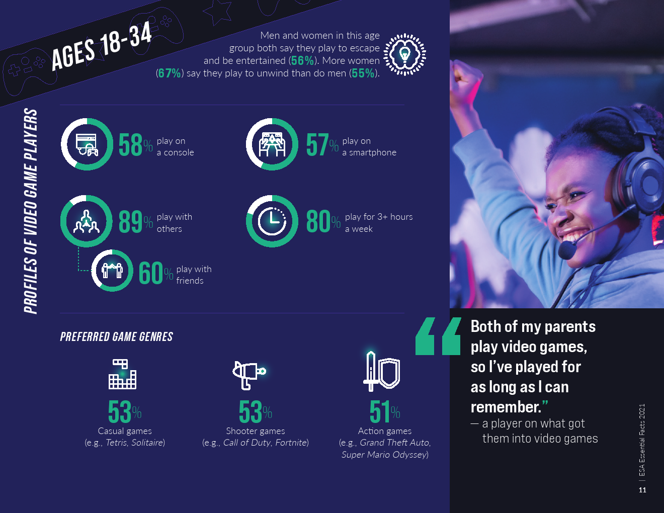 近2.27亿美国人玩电子游戏。2/3的成年人和3/4的18岁以下的孩子每周玩电子游戏。在所有年龄段中,80%的玩家超过18岁,电子游戏玩家的平均年龄为31岁。总的来说,玩家大约一半是女性(45%),一半是男性(55%)。玩家们一致认为,电子游戏可以将不同类型的人聚集在一起(89%),为不同能力的人创造无障碍的体验(89%)。