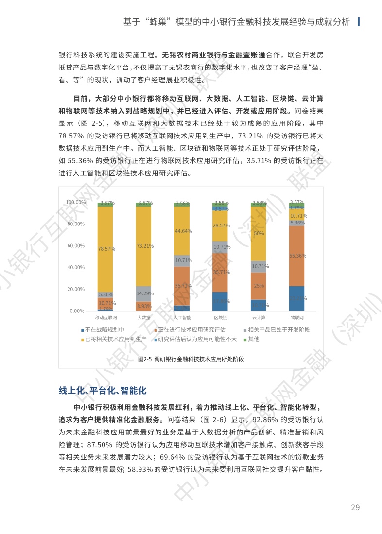 从具体业务和技术来看,69.64%的受访银行重点在“手机银行、网上银行”领域发力,直销银行、基于社交平台的金融服务、线上供应链金融等线上业务普遍得到重视。作为一系列线上应用的底层支撑,大数据、云计算、人工智能、区块链等技术应用深度进一步加深,78.57%的受访银行已将移动互联网技术应用到生产中,73.21%的受访银行已将大数据技术应用到生产中。人工智能、区块链、物联网等技术也成为中小银行重点研究评估的对象。