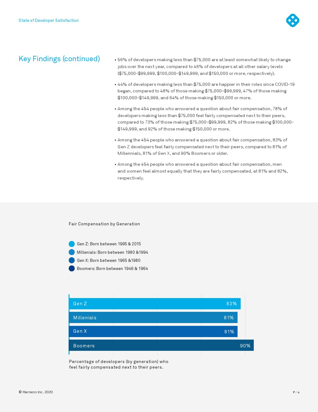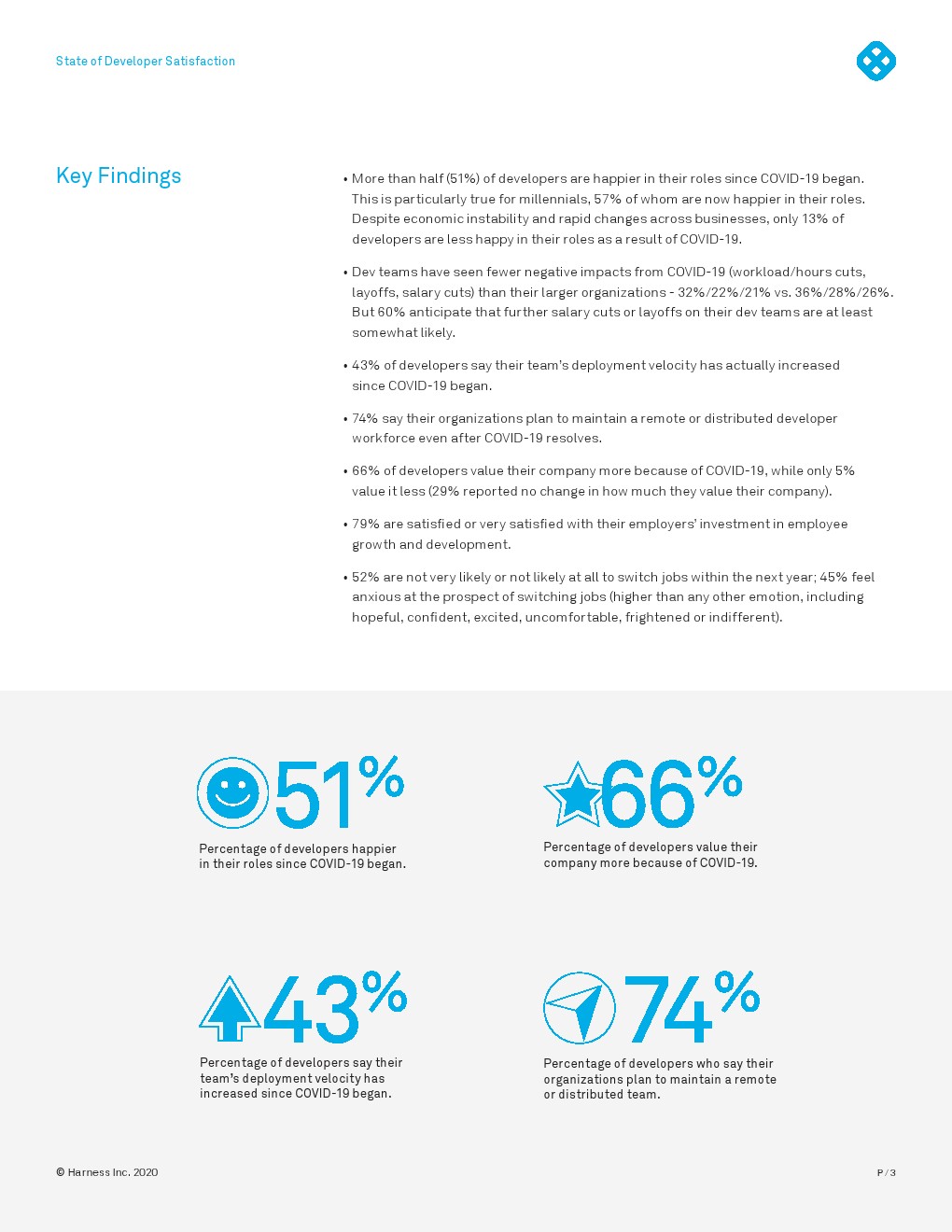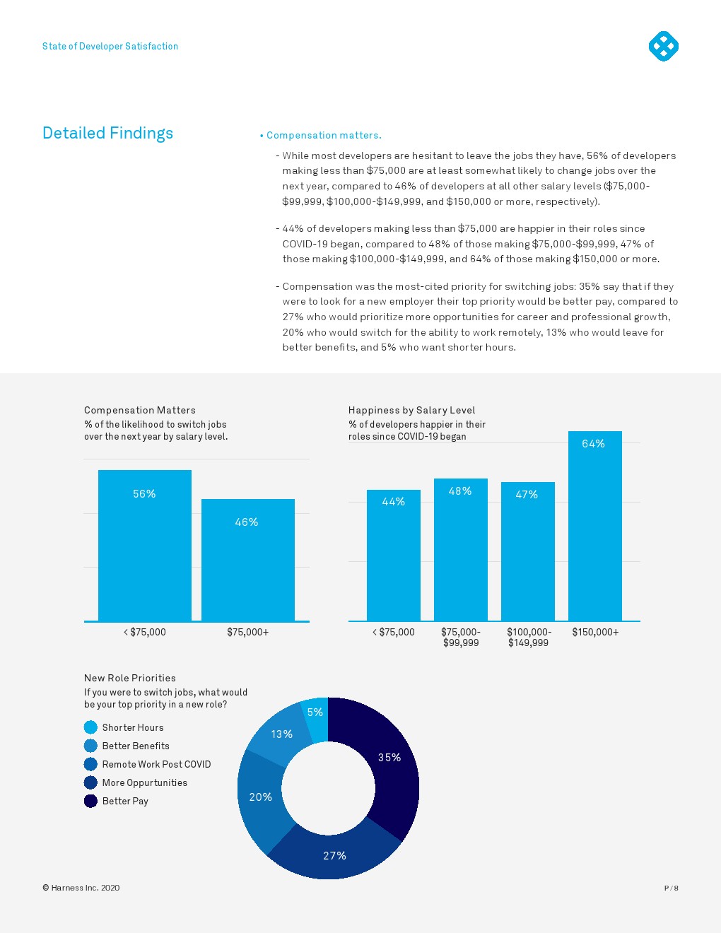 令人鼓舞的结果是,尽管焦虑,超过一半的开发者在他们的角色上更快乐,他们不太可能尝试换工作,而且大多数人至少和他们之前一样快乐。大多数人对雇主的支持和投资以及远程工作的持续灵活性感到满意,但薪酬是满意度的关键因素。