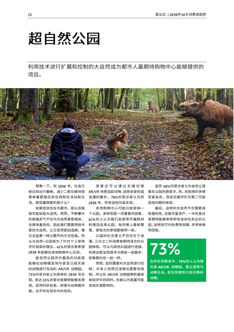 由数字技术扩展和控制的“大自然”,会成为都市居民最期待的购物中心体验项目。73%的受访者认为,将出现与动物(甚至是已灭绝的动物)互动的AR/VR动物园。