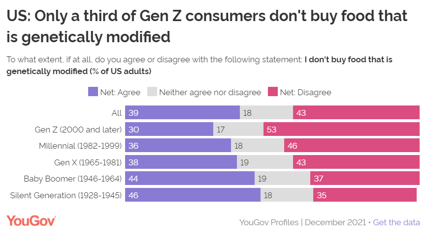 当YouGov深入研究时,出现了一个有趣的代际趋势。年轻美国人更倾向于购买转基因食品,略多于一半的Z世代 (53%)表示他们会这样做。这个数字随着年龄的增长而缩小。相反,那些表示他们不接受转基因食品的人的比例则随着年龄增长而增加,从Z世代的30%上升到沉默一代的46%。
