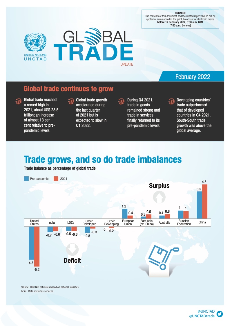 联合国贸易和发展会议今天发布的《全球贸易最新情况》(Global Trade Update)报告显示,2021年第四季度,所有主要贸易经济体的进出口都超过了新冠疫情前的水平,发展中国家的货物贸易增长比发达国家更加强劲。
