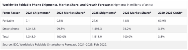 根据IDC发布的数据显示,2021年全球可折叠手机出货量(包括翻盖和折叠屏)总计达到710万部,比2020年增长了264.3%,并预测2025年可折叠手机出货量将达到2760万部,2020年至2025年的复合年增长率(CAGR)为69.9%。