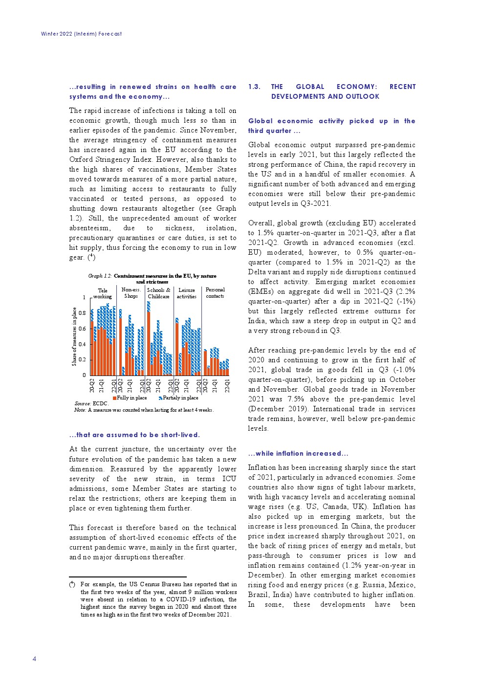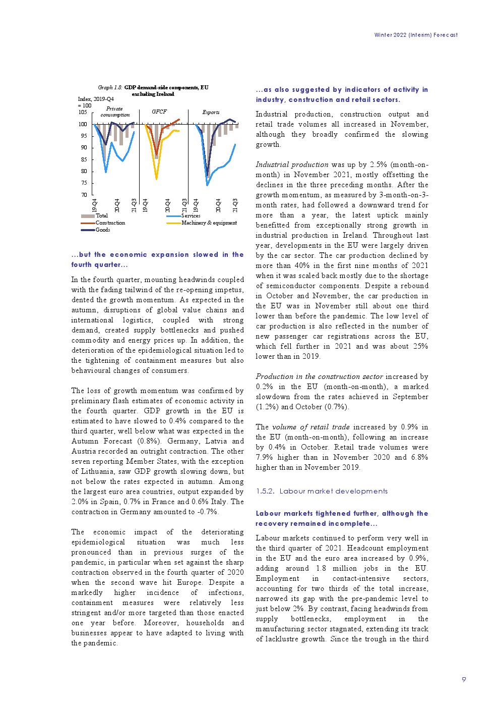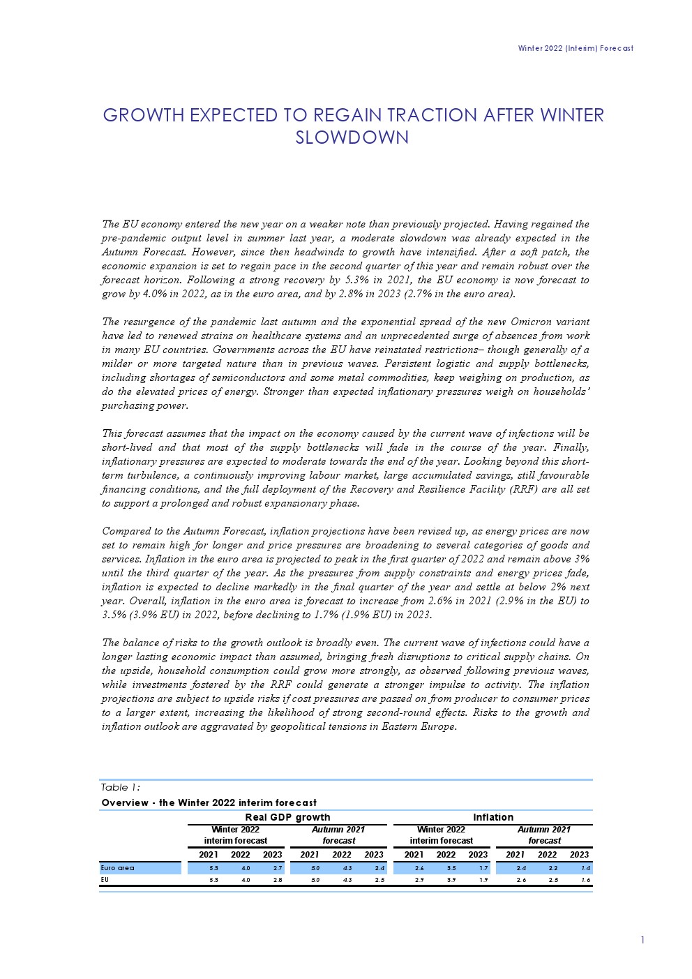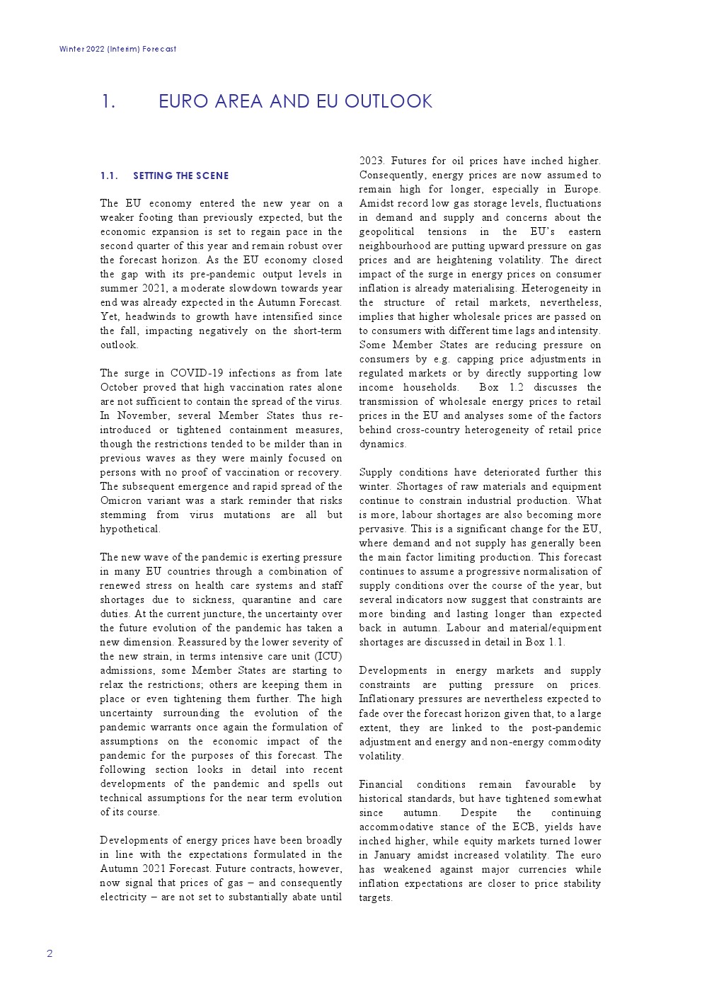 去年秋天大流行的死灰复燃和新的奥密克戎变体的指数级传播导致医疗系统面临新的压力,许多欧盟国家的缺勤率激增。欧盟各国政府已经恢复了限制,尽管通常比前几波更温和或更有针对性。持续的物流和供应瓶颈,包括半导体和一些金属的短缺继续对生产造成压力,能源价格上涨也是如此。强于预期的通胀压力给家庭购买力带来额外压力。