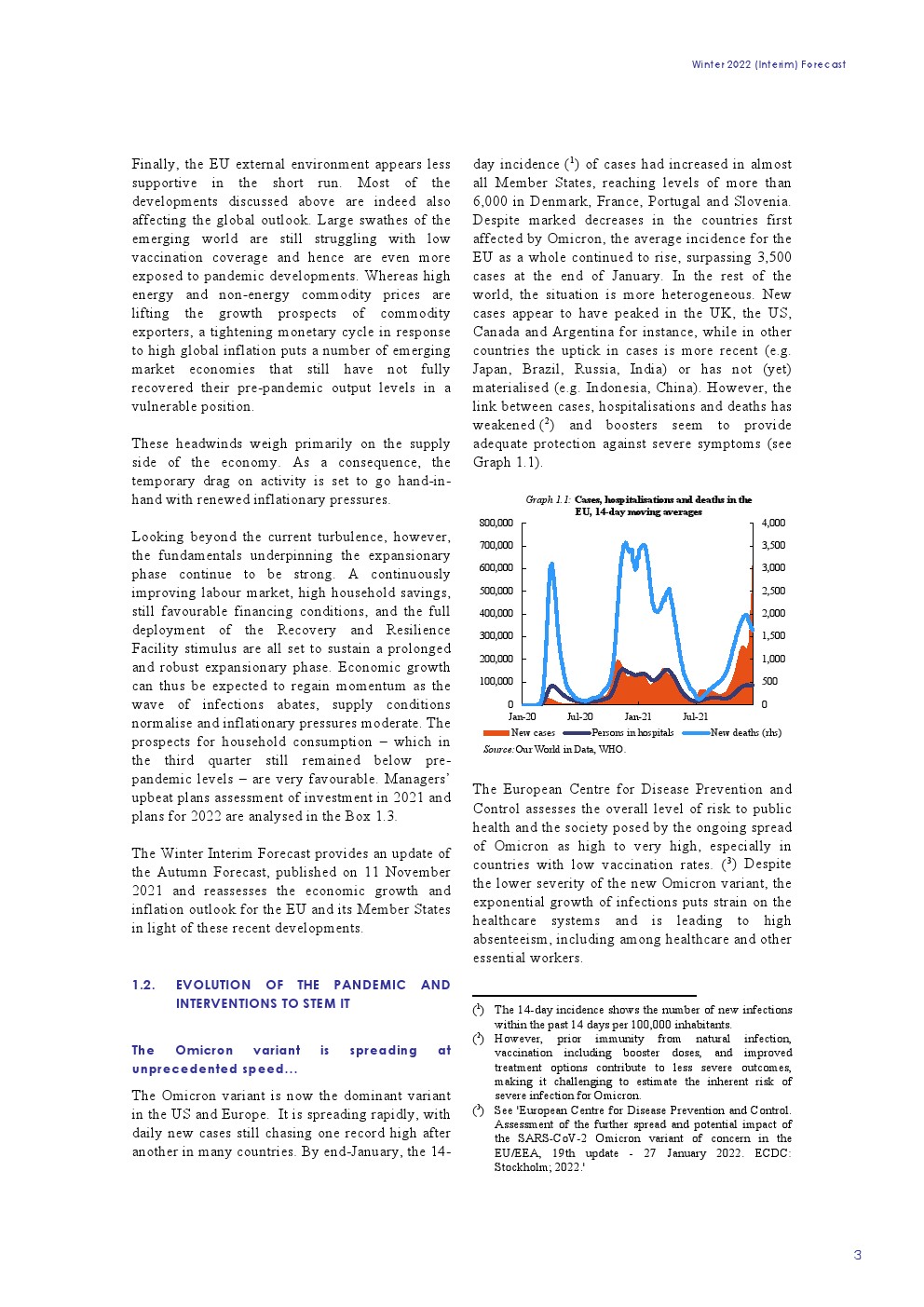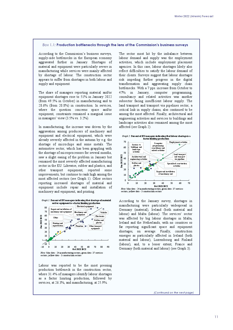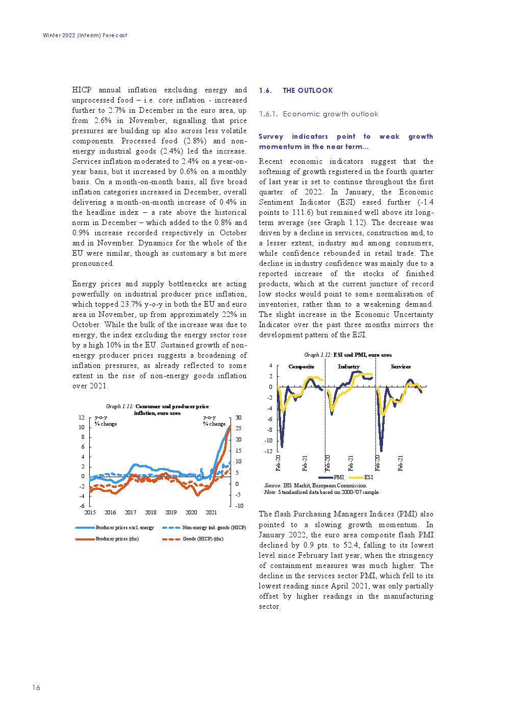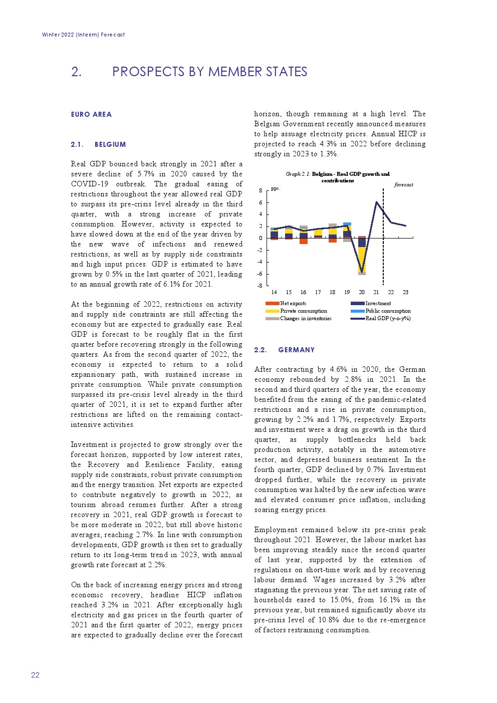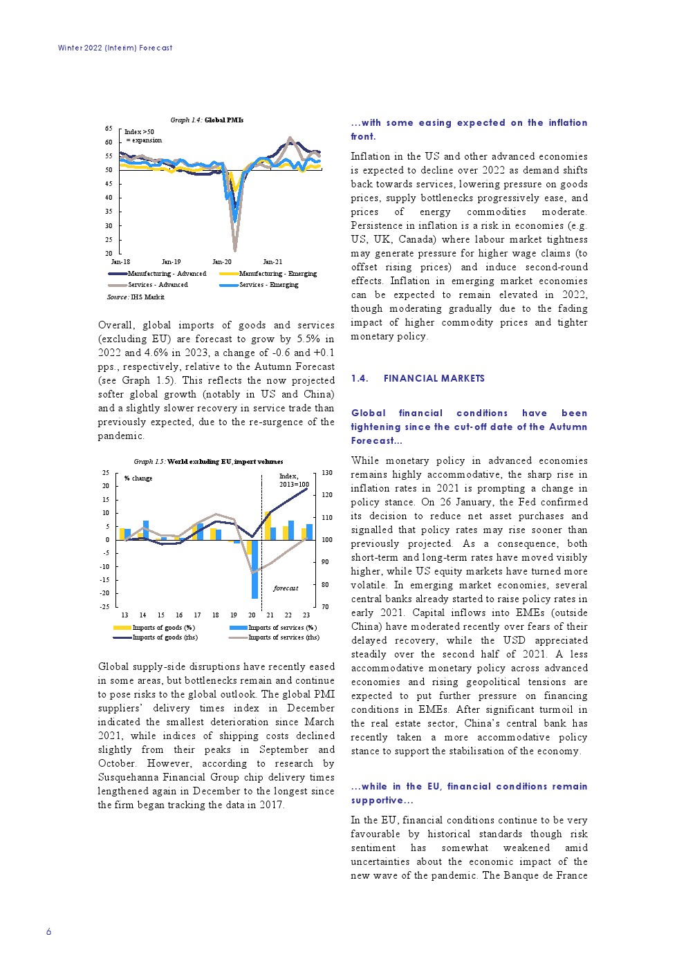 去年秋天大流行的死灰复燃和新的奥密克戎变体的指数级传播导致医疗系统面临新的压力,许多欧盟国家的缺勤率激增。欧盟各国政府已经恢复了限制,尽管通常比前几波更温和或更有针对性。持续的物流和供应瓶颈,包括半导体和一些金属的短缺继续对生产造成压力,能源价格上涨也是如此。强于预期的通胀压力给家庭购买力带来额外压力。