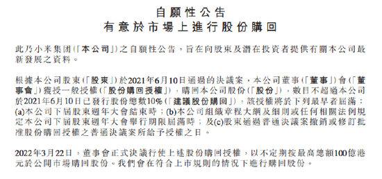 新浪科技讯 3月22日晚间消息,小米集团发布公告称,2022年3月22日,董事会正式决议行使上述股份购回授权,以不定期按最高总额100亿港元于公开市场购回股份。