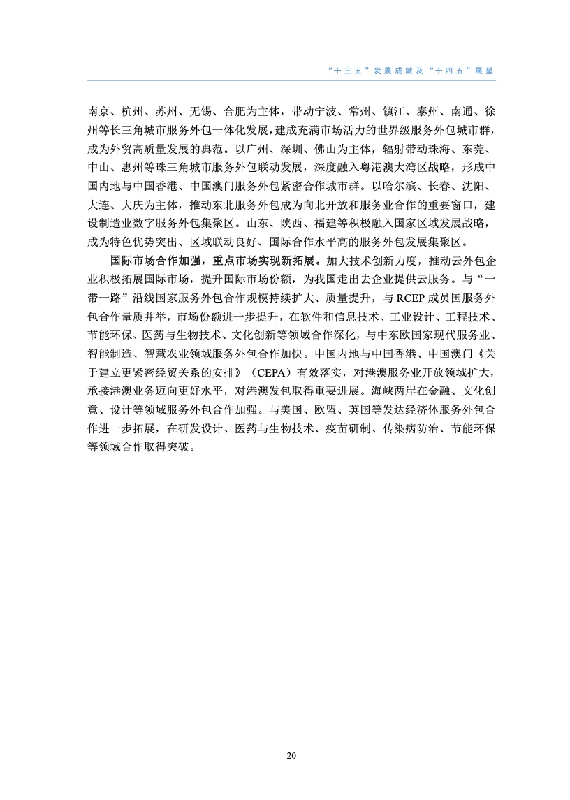 四是包容合作,深化更高水平开放机遇。中国区域经贸合作网络不断完善,服务业对外开放将迈向更高水平。区域全面经济伙伴关系协定(RCEP)为区域经贸发展注入强劲动力。“十四五”期间,高质量共建“一带一路”、推动中日韩自由贸易协定谈判、积极加入全面与进步跨太平洋伙伴关系协定(CPTPP)和数字经济伙伴关系协定(DEPA)将为中国承接离岸服务外包创造良好外部条件,对外发包迎来历史性发展机遇。
