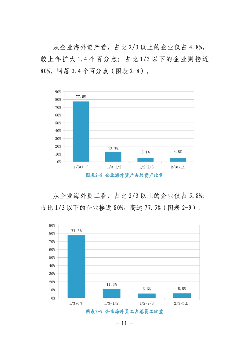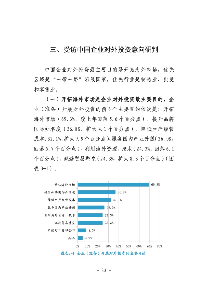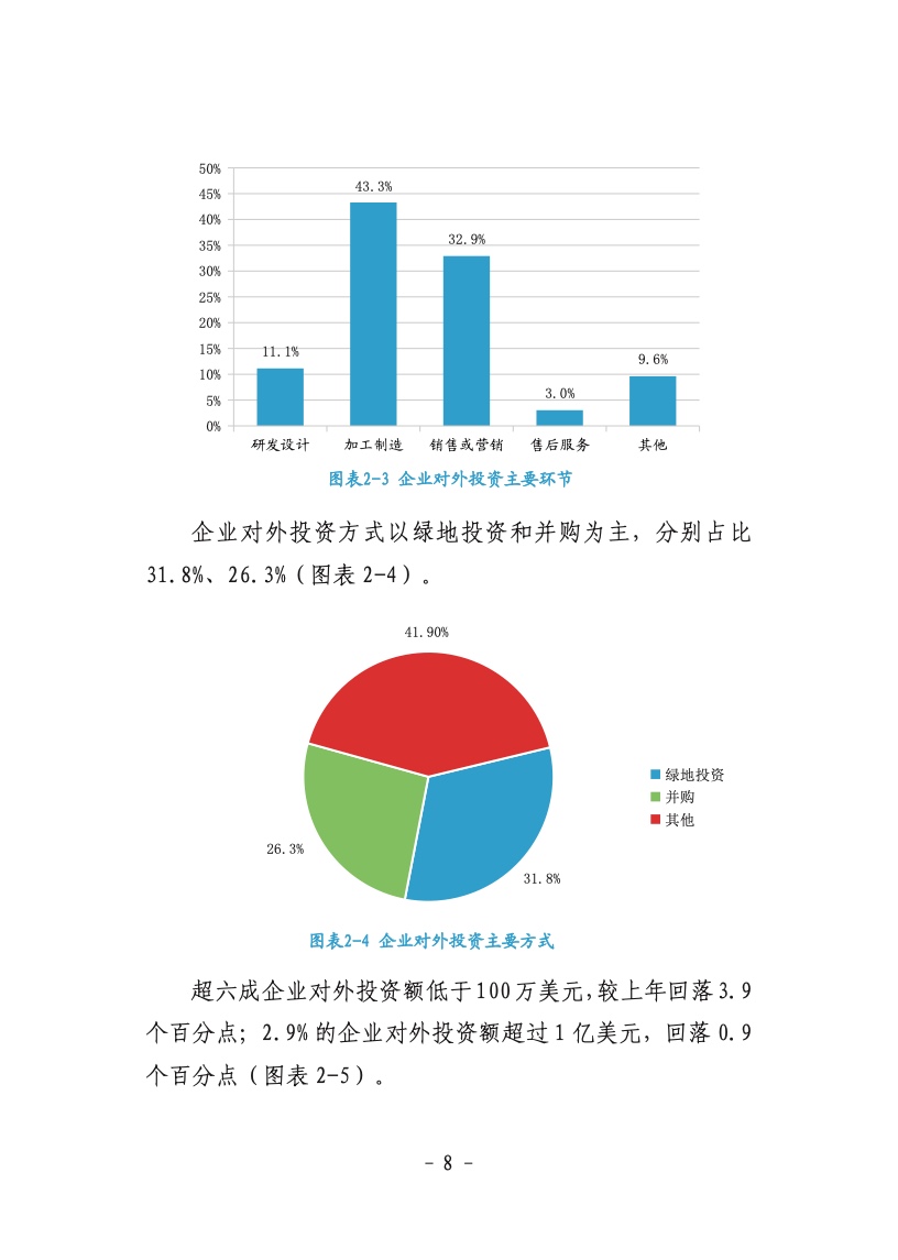 就整体对外投资情况,《报告》分析称,国内外新形势对“走出去”企业影响较为多元。2021 年在全球跨境直接投资强势反弹和中国加快构建新发展格局背景下,近八成中国企业维持和扩大对外投资意向;超半数企业对外投资优先选择制造业;超六成企业对外投资为小额项目。