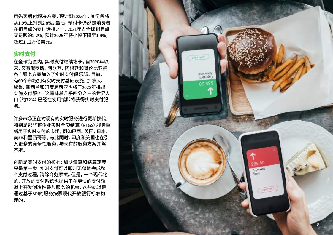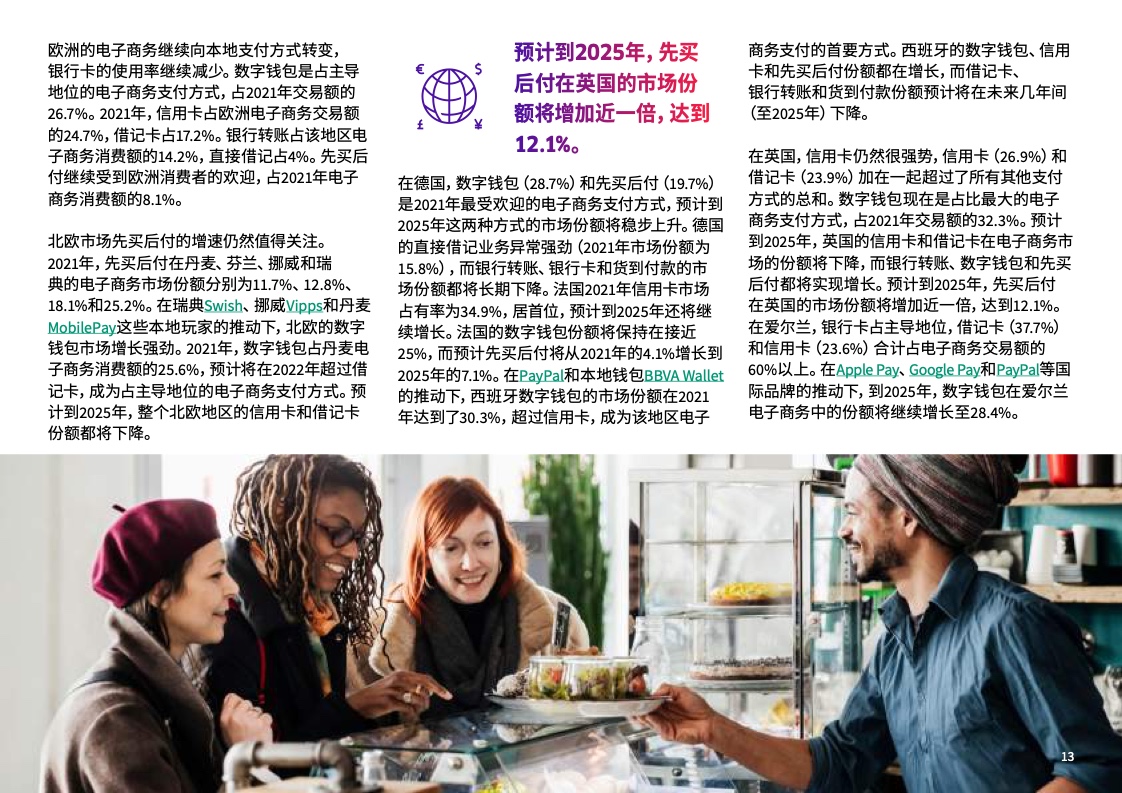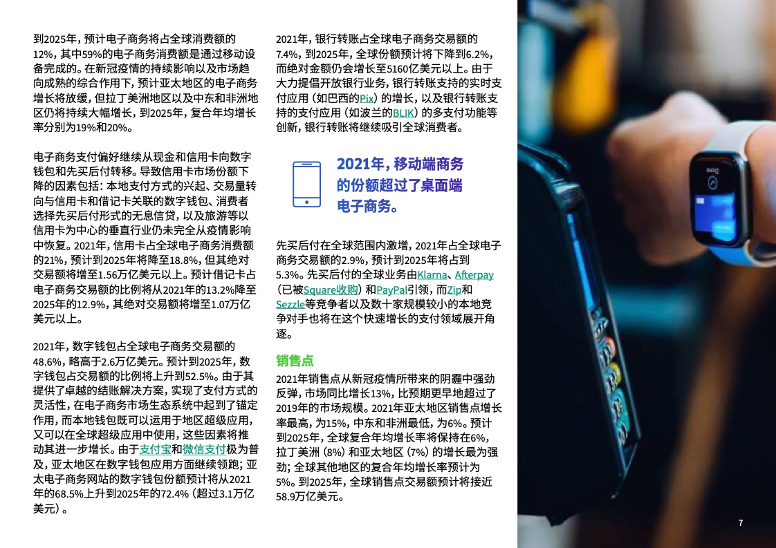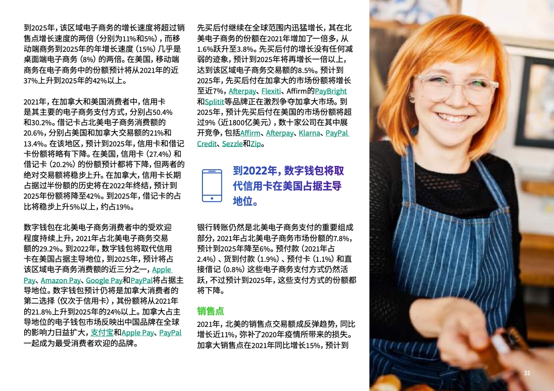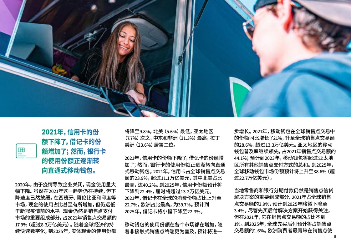 预计至2025年在全球销售点总交易额中现金支付的份额将自2021年的18%降到10%以下。在中国,现金支付份额将持续下滑,预计至2025年在销售点总交易额中的份额将自2021年的10%降到3%。在中国,移动钱包的增速正超过销售点其他全部支付方式的整体增速,在2021年占销售点总交易额的54%。在中国,先买后付(BNPL)作为一种相对较新的支付方式,正开始在销售点支付方式中占据一席之地,预计至2025年占销售点总交易额的1%,规模达到2800亿美元。