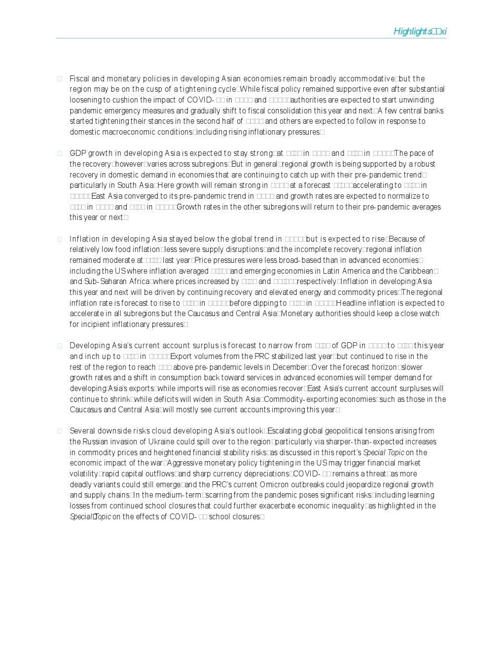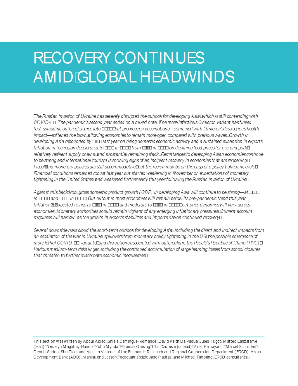 亚洲发展中经济体的经济增长在2021年反弹6.9%,但该地区大部分的复苏在很大程度上仍不完全。在大宗商品价格上涨的支持下,高加索和中亚的扩张使国内生产总值(GDP)比大流行前低4%。在南亚,尽管印度消费和投资激增带来强劲增长,但差距仍保持在8%左右。东南亚的差距为10%,太平洋地区为12%。这些次区域的复苏因对国内活动和国际旅行严格控制而延迟,这尤其阻碍了依赖旅游业的经济体。东亚因外部需求旺盛而逆势而上;它的差距仅比大流行前的趋势低1%。