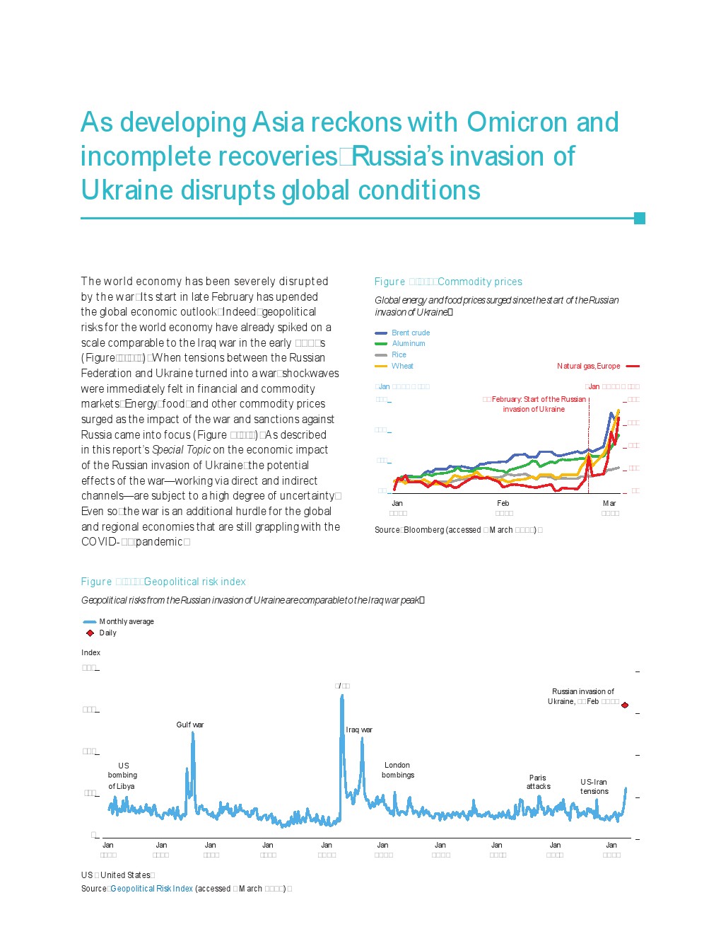 Omicron对健康的影响较轻,加上免疫力增强,使亚洲发展中国家在2022年初保持相对开放。因此,在Omicron浪潮中,区域经济体的表现优于之前的新冠爆发。虽然一些经济体的增速略低于去年第四季度,但是制造业和服务业在1月和2月继续扩张。