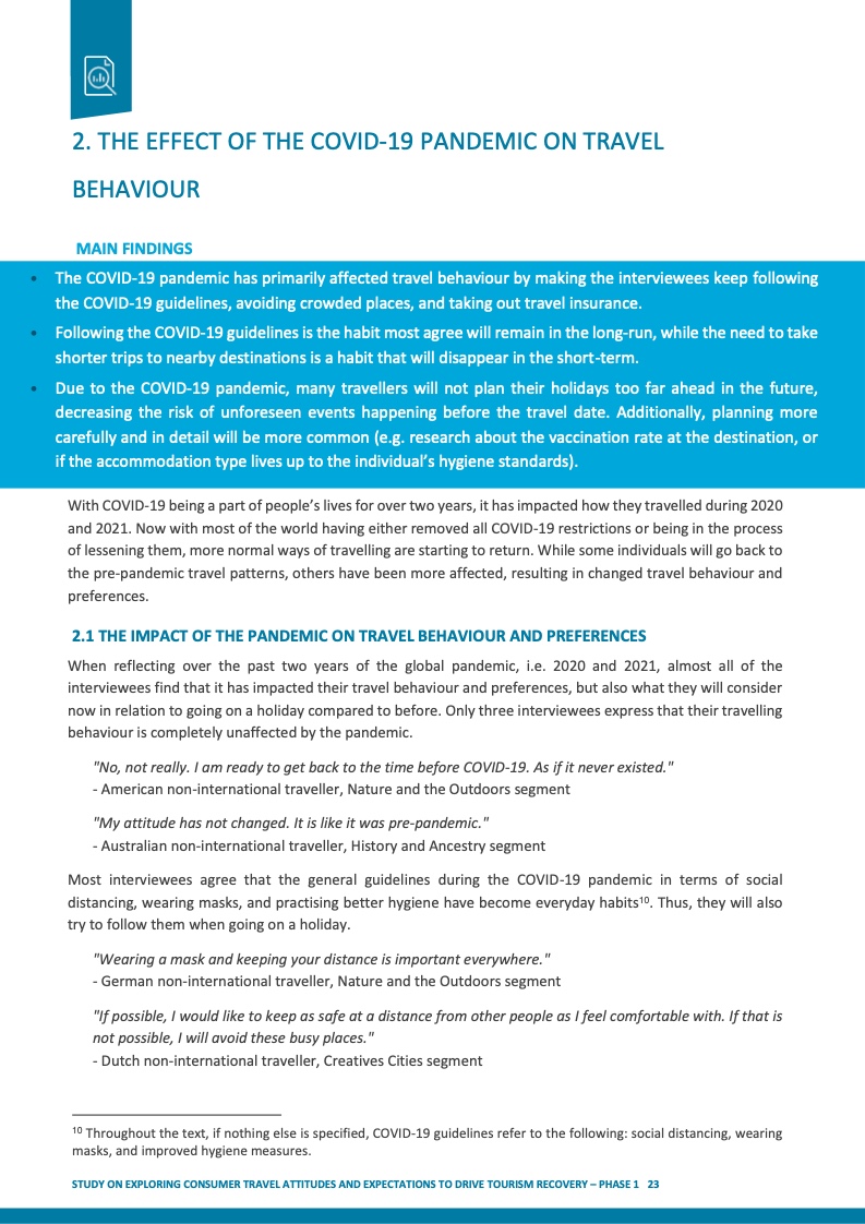 疫情的一个显著影响是,旅客变得更加谨慎,他们提前预订旅游产品的时间缩短,制定的行程更详细。具体来说,他们出发前会向旅行社咨询,更关注取消政策,尽量不坐飞机。在出行期间,会避免去人流量大的地方,预订民宿或选择露营,而非入住酒店,更多地选择户外活动,等等。只有8%的受访者表示,疫情对他们的旅行行为和倾向并无实质性影响。