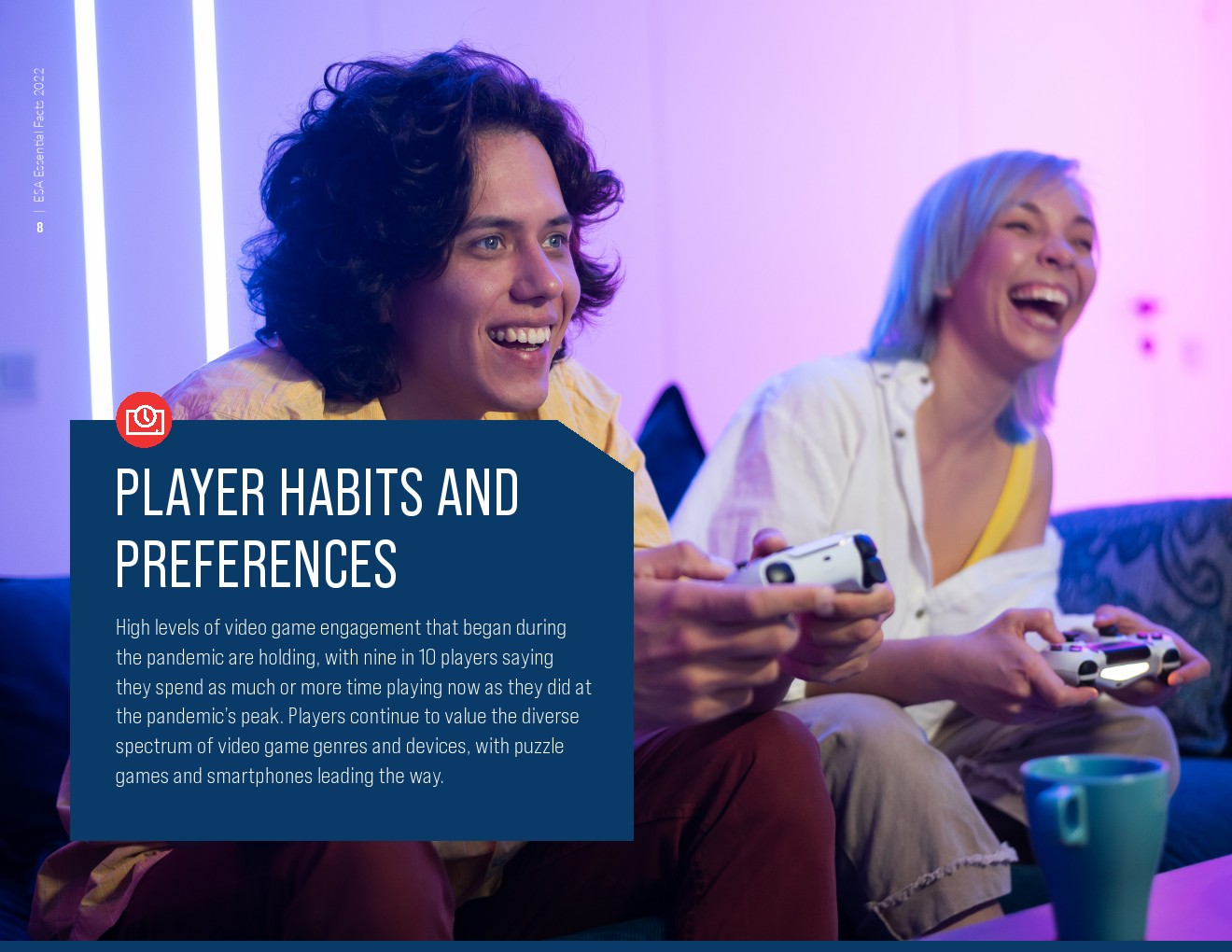 ESA发布了“2022年视频游戏行业报告”。现在66%的美国人经常玩电子游戏,相当于超过2.15亿不同年龄和背景的玩家。其中3/4超过18岁,视频游戏玩家的平均年龄为33岁。在所有年龄段中,玩家大约一半是女性(48%),一半是男性(52%)。电子游戏已成为许多人生活中重要的一部分,9/10的玩家表示,他们现在花在游戏上的时间与大流行高峰时一样多或更多。
