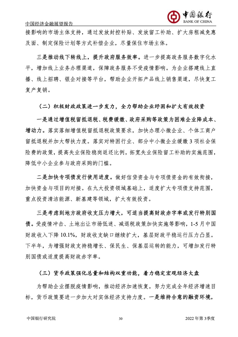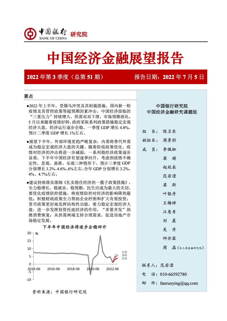 考虑到疫情不确定性,悲观、基准、乐观三种情形下,预计三季度GDP分别增长3.2%、4.6%、6%左右,全年GDP分别增长3.2%、4%、4.7%左右。建议持续落实落细《扎实稳住经济的一揽子政策措施》,全力稳增长、稳就业、稳预期。