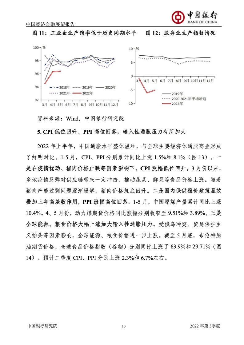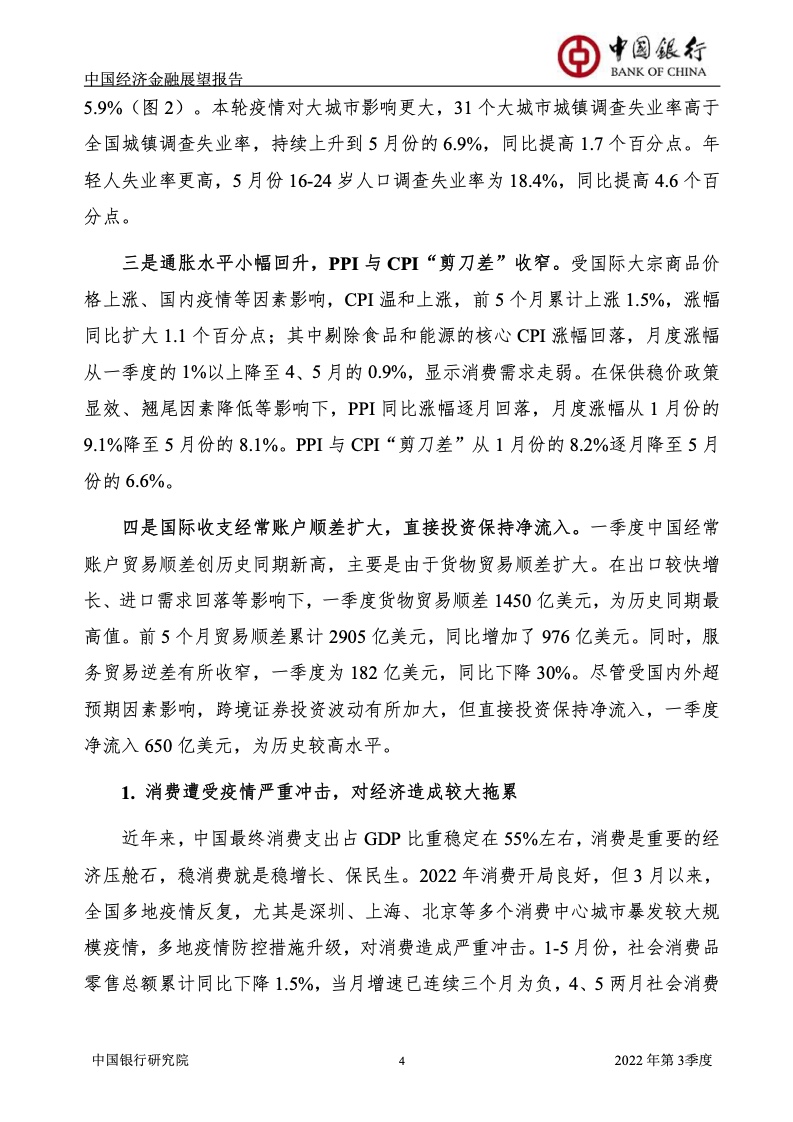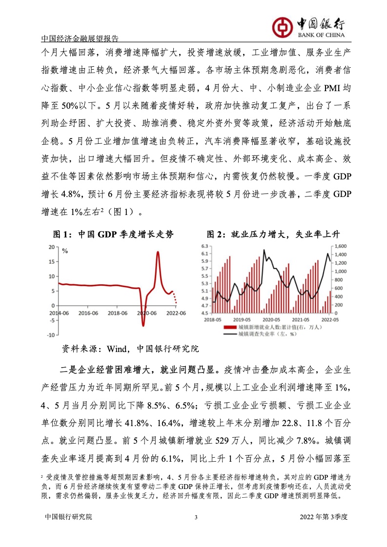 《报告》认为,2022年上半年,受俄乌冲突及其制裁措施、国内新一轮疫情及其管控政策等超预期因素冲击,中国经济面临的“三重压力”持续增大,供需双双下滑,市场预期恶化。一季度GDP增长4.8%,预计二季度GDP增长1%左右。
