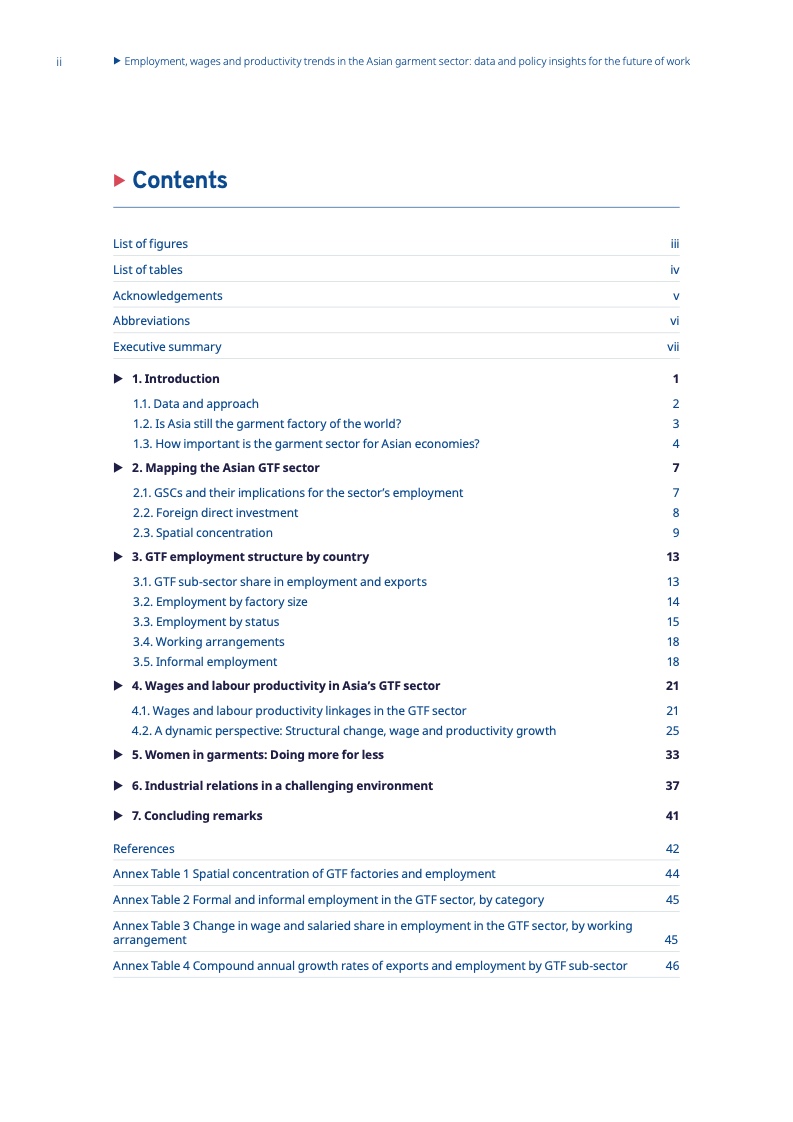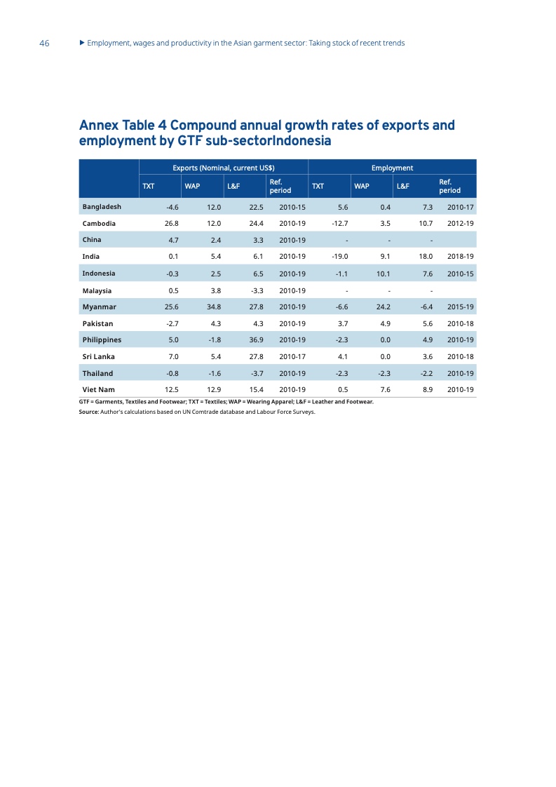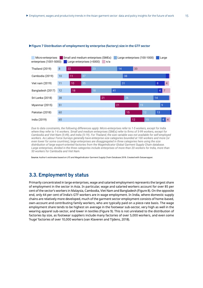尽管在大多数国家,工资和受薪就业占有高比例并由大公司占主导地位,但出于普遍的非正规性和临时性质的工作安排,行业中很大一部分工人仍处境脆弱。在服装行业,女性员工比例最低的国家的性别薪酬差距最高。