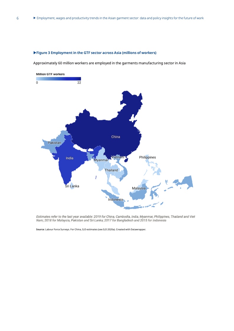 根据国际劳工组织最新报告,亚洲仍是世界最大的服装制造地,占全球纺织品和服装出口的55%,并有六千万工人从事相关工作。