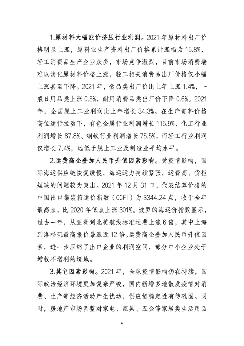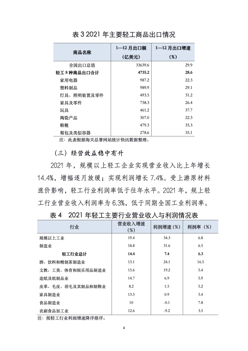 全年轻工业增加值比上年增长 11.1%,实现营业收入增长14.4%,实现利润增长 7.4%;轻工全行业出口突破9000 亿美元,增长 30%,为国民经济稳增长做出积极贡献,为“十四五”高质量发展打下良好基础。