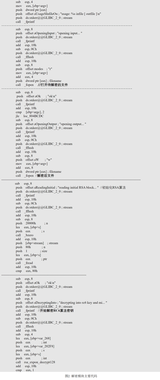解密模块是通用模块,可被其他模块调用对指定文件进行解密,采用了与NOPEN远控木马(参见《“NOPEN”远控木马分析报告》)类似的RSA+RC6加密算法。如图2所示。