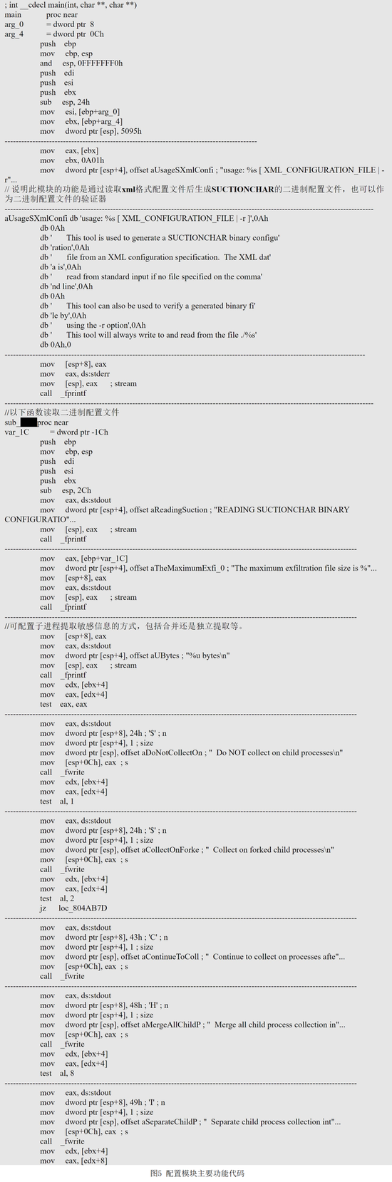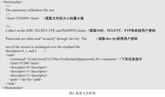 配置模块的主要功能是读取攻击者远程投送的xml格式配置文件中的指令和匹配规则,并生成二进制配置文件,从而由“监视模块”和“间谍模块”调用后在受害主机上查找相关内容。如图4、图5所示。