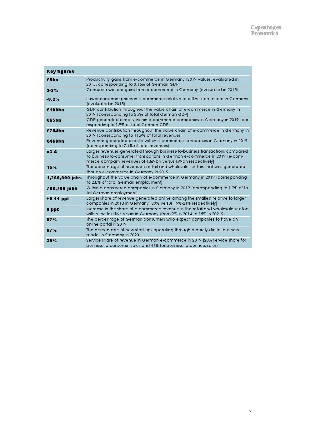 电子商务的发展在多个方面为消费者、企业和更广泛的社会创造了巨大的经济价值。零售环节的加价降低,相对于线下销售降低了0.2%的价格。在对从线下购物向在线购物的转变进行建模时,电子商务带来的生产力收益可能占德国GDP的0.15%,相当于50亿欧元。